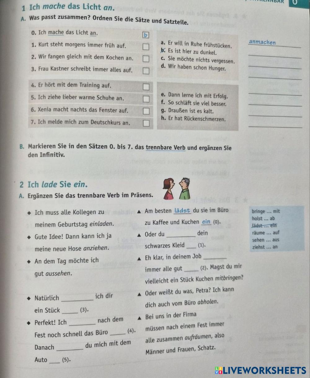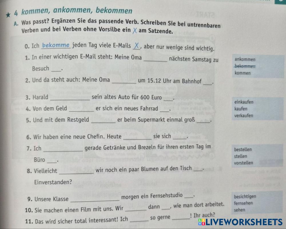 Created byKateryna Shevchuk ESL German A2 Grammar German Author's Instructions Trennbare oder untrennbare Verben ergänzen My Google Classroom Courses × 0 classes selected (0 students total) Quick Access Select all classes (0 classes) All Classes Loading courses... Cancel Share Share to selected Course __COURSE_NAME__ __STUDENT_NAME__ (__STUDENT_EMAIL__) Verb: Trennbar/Untrennbar Download Worksheet Validation Check my answers Emails my answers to my teacher Full name Group/level School subject Teacher's email or key code Close Submit Validating worksheet... (12) Your answers have been sent to your teacher. Good luck! OK We encountered an error submitting your answers. Please try again. OK Advertisement | Go Ad Free Created byKateryna Shevchuk ESL German A2 Grammar German Author's Instructions Trennbare oder untrennbare Verben ergänzen Explore Worksheets Was ist richtig? ESL A2 Was ist richtig? Grammar - ESL Hörverstehen mit Verben mit Akkusativ Modalverben ESL A2 Modalverben Grammar - ESL Was passt? Modalverben ESL A2 Modalverben Grammar - ESL Richtige Verbform schreiben Nebensätze mit WENN ESL A2 Nebensätze mit WENN Grammar - ESL Verbinde die Sätze mit der Konjunktion WENN!