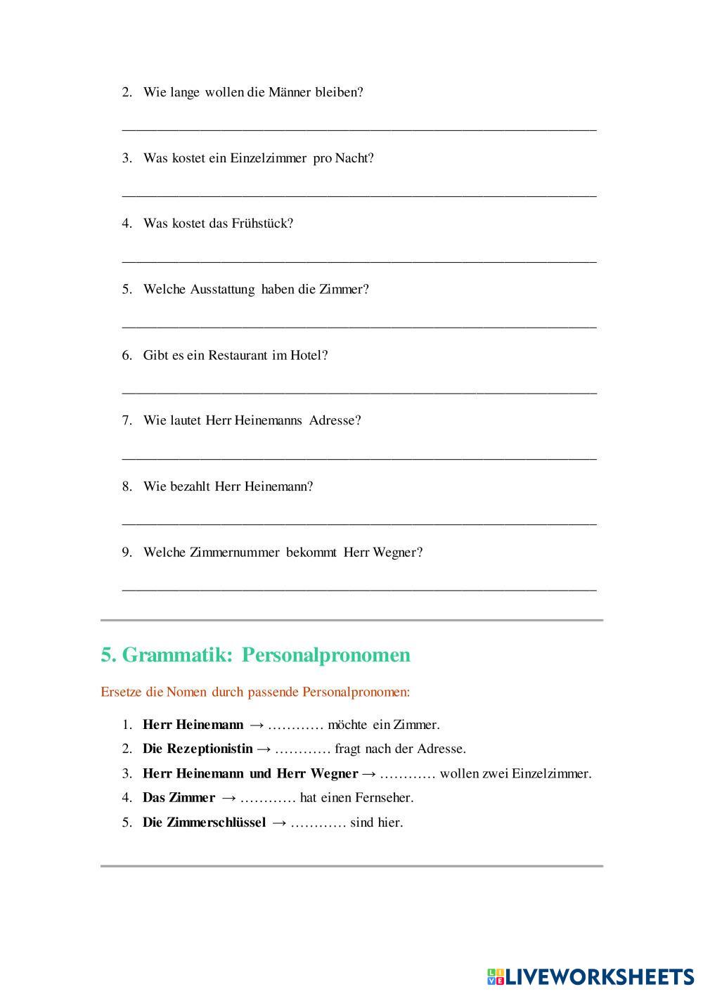 Created by amazonen ESL German A1-Beginner Listening German Author's Instructions Hören und lesen Sie. Erfüllen Sie Aufgaben zum Dialog. My Google Classroom Courses × 0 classes selected (0 students total) Quick Access Select all classes (0 classes) All Classes Loading courses... Cancel Share Share to selected Course __COURSE_NAME__ __STUDENT_NAME__ (__STUDENT_EMAIL__) A1: L3 Unterwegs in München, S. 58 Dialog - An der Rezeption Download Worksheet Validation Check my answers Emails my answers to my teacher Full name Group/level School subject Teacher's email or key code Close Submit Validating worksheet... (12) Your answers have been sent to your teacher. Good luck! OK We encountered an error submitting your answers. Please try again. OK Advertisement | Go Ad Free Created by amazonen ESL German A1-Beginner Listening German Author's Instructions Hören und lesen Sie. Erfüllen Sie Aufgaben zum Dialog. Explore Worksheets Hören - Test 3 ESL A1-Beginner Hören - Test 3 Listening - ESL Hören Sie und antworten Sie. 3. Klasse 8. Woche ESL A1-Beginner 3. Klasse 8. Woche Listening - ESL hör gut zu Hören Nummer A1 ESL A1-Beginner Hören Nummer A1 Listening - ESL Hören Sie und ergänzen Sie. Gute Laune Lied ESL A1-Beginner Gute Laune Lied Listening - ESL Lied