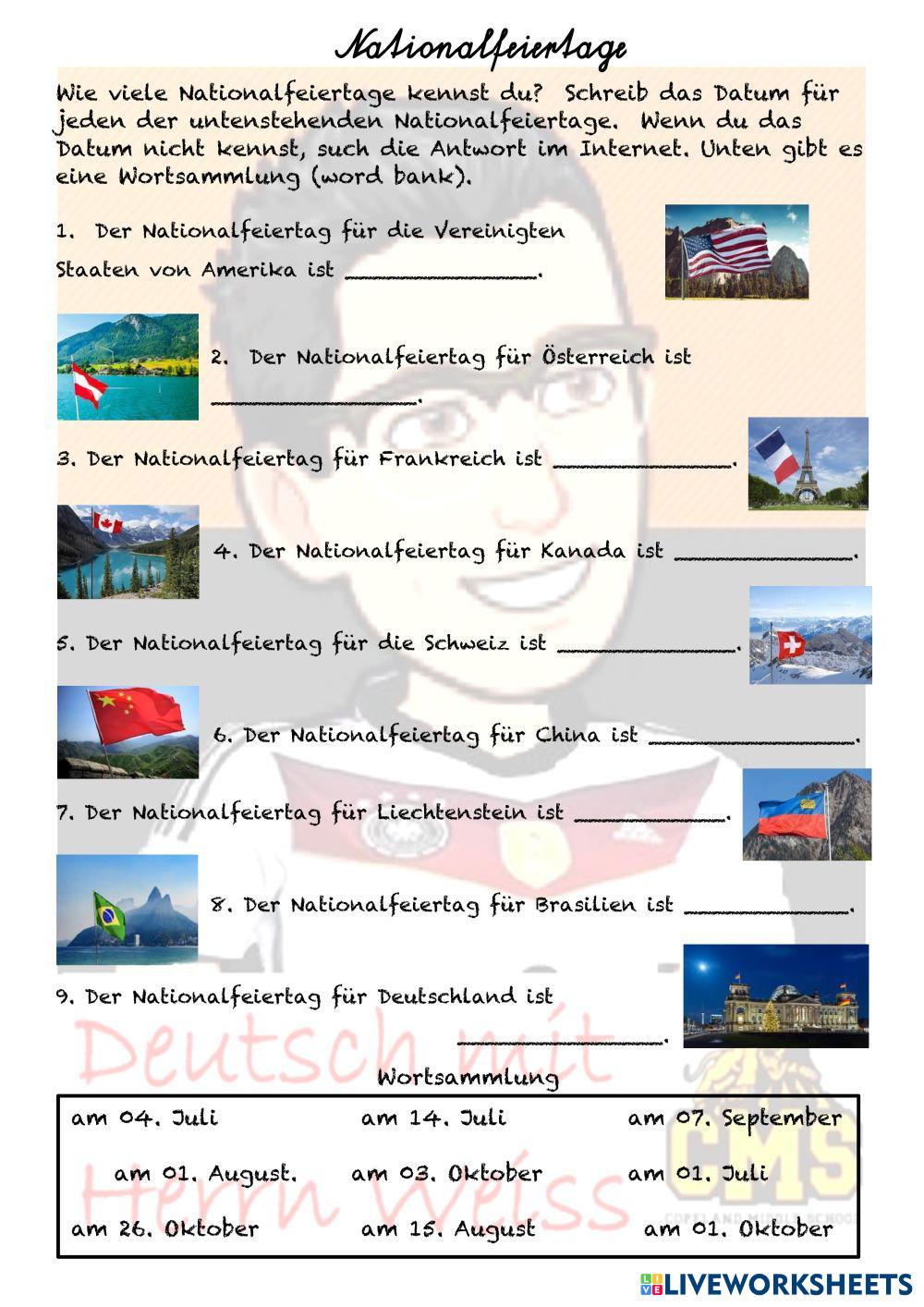 Dates of several national holidays to introduce topic of Tag der deutschen Einheit.