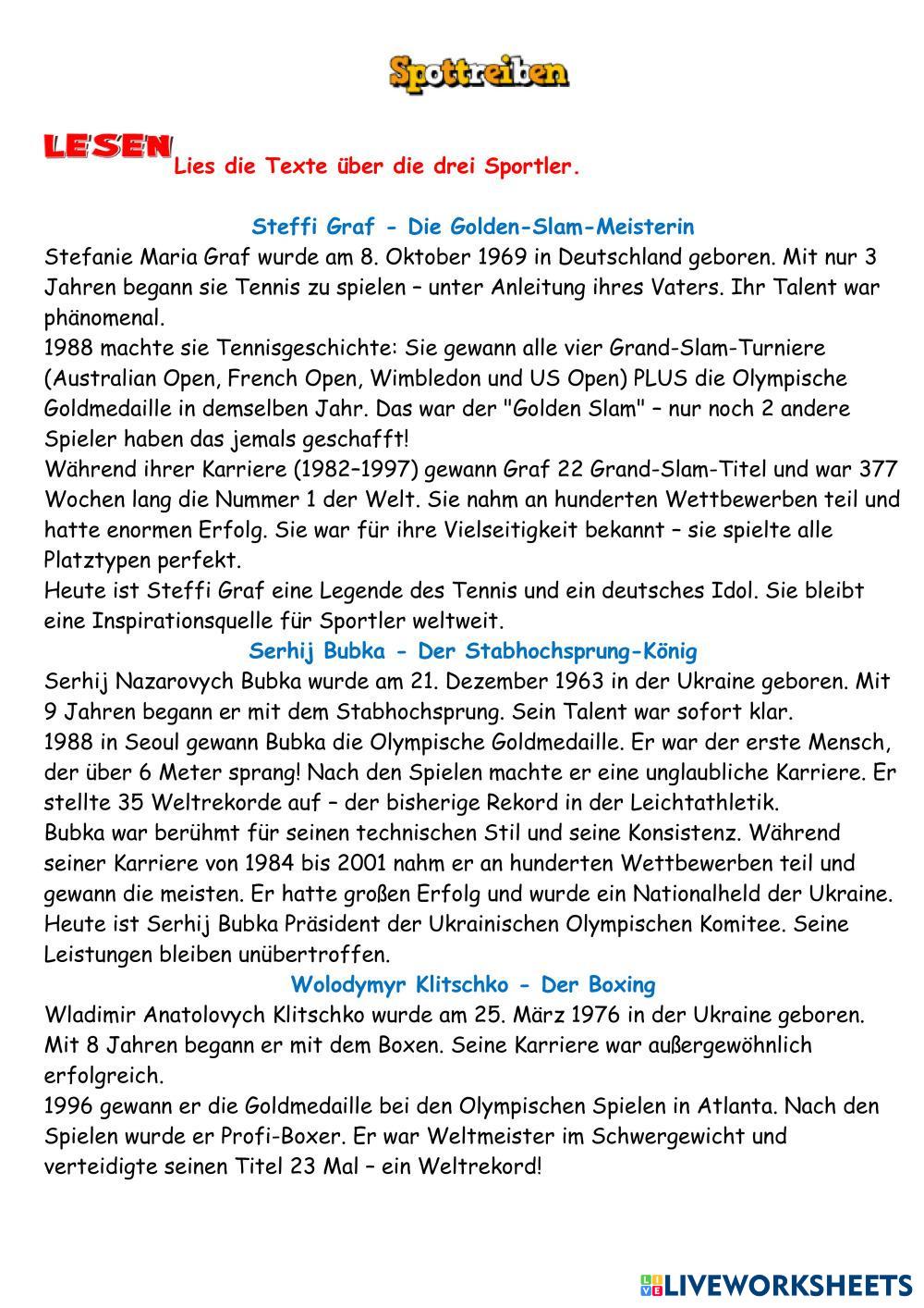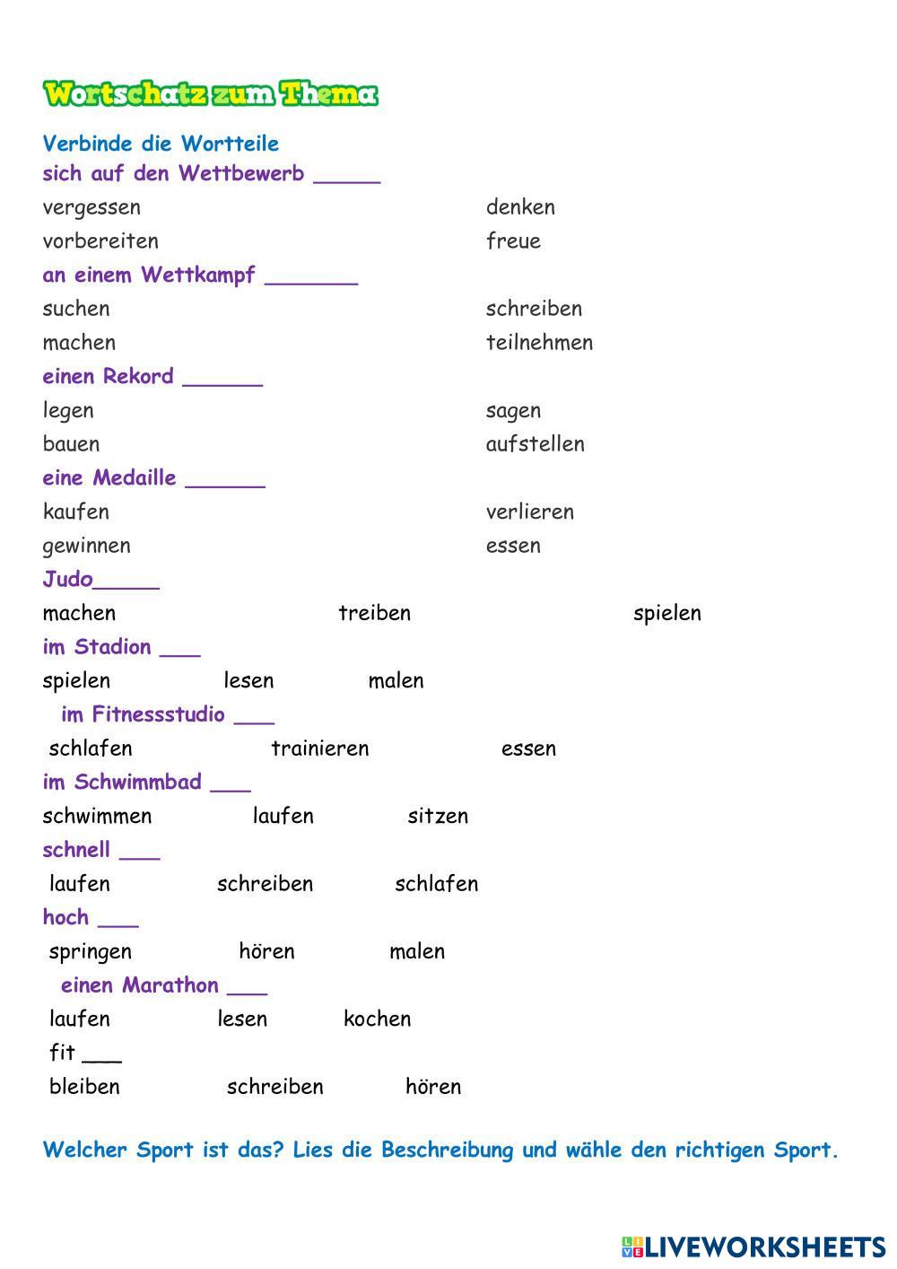 Created by AlionaBudnyk ESL A2 Reading German Author's Instructions - My Google Classroom Courses × 0 classes selected (0 students total) Quick Access Select all classes (0 classes) All Classes Loading courses... Cancel Share Share to selected Course __COURSE_NAME__ __STUDENT_NAME__ (__STUDENT_EMAIL__) 8 клас .Тема 6. Sporttreiben(Сотнікова, НУШ) Download Worksheet Validation Check my answers Emails my answers to my teacher Full name Group/level School subject Teacher's email or key code Close Submit Validating worksheet... (12) Your answers have been sent to your teacher. Good luck! OK We encountered an error submitting your answers. Please try again. OK Advertisement | Go Ad Free Created by AlionaBudnyk ESL A2 Reading German Author's Instructions - Explore Worksheets Prepare 7 U15 L3 Reading ESL A2 Prepare 7 U15 L3 Reading Reading - ESL Read the blog and do the tasks. Wider world 2 (9.3) ESL A2 Wider world 2 (9.3) Reading - ESL Exploring nature Talking Sport A2 Reader Multiple Matching ESL A2 Talking Sport A2 Reader Multiple Matching Reading - ESL Read the three texts and match them with the questions below. Understanding Characters ESL A2 Understanding Characters Reading - ESL Understanding Characters