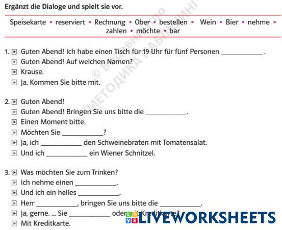 Created by tatavas ESL German A2 Vocabulary German Author's Instructions Ergänzt die Dialoge und spielt sie vor My Google Classroom Courses × 0 classes selected (0 students total) Quick Access Select all classes (0 classes) All Classes Loading courses... Cancel Share Share to selected Course __COURSE_NAME__ __STUDENT_NAME__ (__STUDENT_EMAIL__) In der Gaststätte Download Worksheet Validation Check my answers Emails my answers to my teacher Full name Group/level School subject Teacher's email or key code Close Submit Validating worksheet... (12) Your answers have been sent to your teacher. Good luck! OK We encountered an error submitting your answers. Please try again. OK Advertisement | Go Ad Free Created by tatavas ESL German A2 Vocabulary German Author's Instructions Ergänzt die Dialoge und spielt sie vor Explore Worksheets Sich vorstellen und kennenlernen ESL A2 Sich vorstellen und kennenlernen Vocabulary - ESL Erste Kontakte на німецькій (Перші контакти) Lerne, wie man sich auf Deutsch vorstellt und andere kennenlernt. Mache die Übungen unten. Навчися представлятися та знайомитися німецькою мовою. Виконай вправи нижче. Dabei 2.2 Modul 14 Test ESL A2 Dabei 2.2 Modul 14 Test Vocabulary - ESL Was passt wohin? Menschen A2.1 L11 ESL A2 Menschen A2.1 L11 Vocabulary - ESL Erledige den Test Wortschatz: Verben mit Dativ ESL A2 Wortschatz: Verben mit Dativ Vocabulary - ESL A2 Niveau