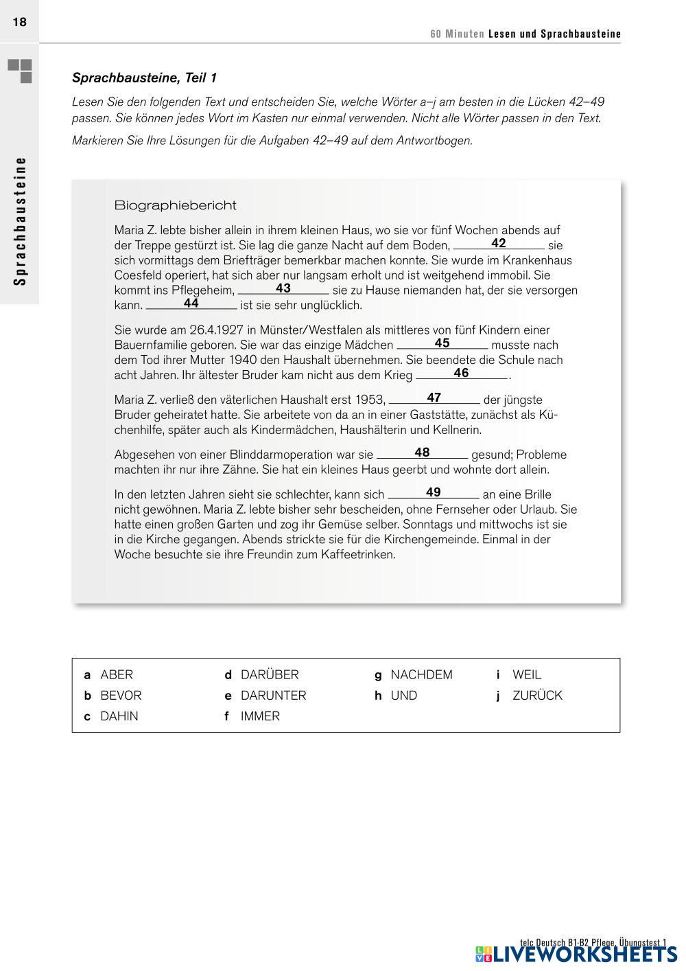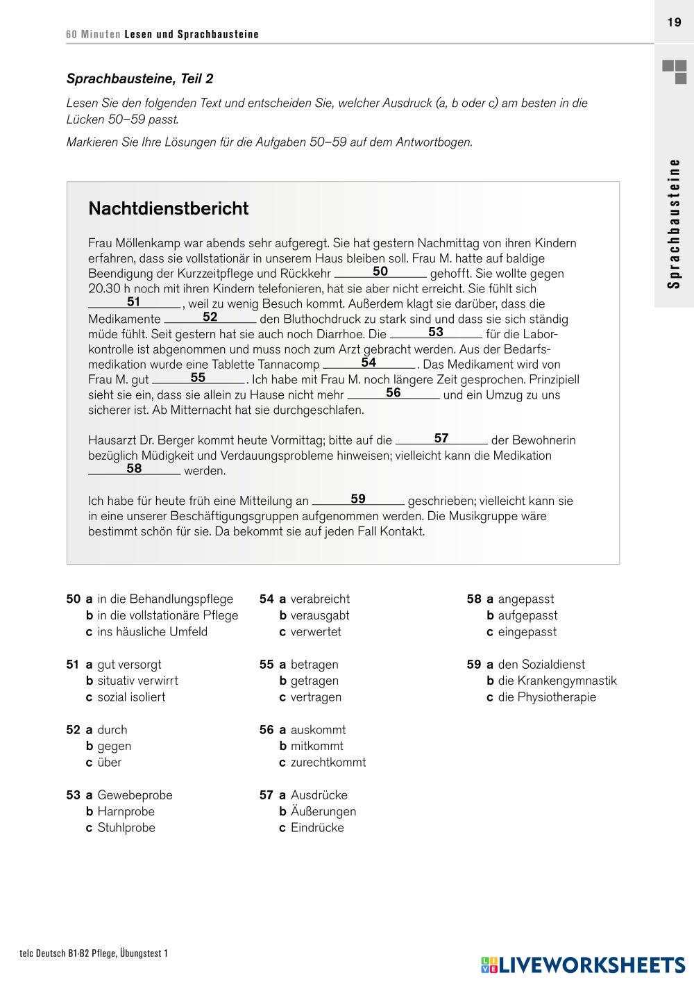 Created byB4M BOGOTA Telc Vorbereitung Sprachbausteine 1 Age 18+ level: B2 German Author's Instructions My Google Classroom Courses × 0 classes selected (0 students total) Quick Access Select all classes (0 classes) All Classes Loading courses... Cancel Share Share to selected Course __COURSE_NAME__ __STUDENT_NAME__ (__STUDENT_EMAIL__) MT1 Telc Pflege - Sprachbausteine Teil 1 & 2 Download Worksheet Validation Check my answers Emails my answers to my teacher Full name Group/level School subject Teacher's email or key code Close Submit Validating worksheet... (12) Your answers have been sent to your teacher. Good luck! OK We encountered an error submitting your answers. Please try again. OK Advertisement | Go Ad Free Created byB4M BOGOTA Telc Vorbereitung Sprachbausteine 1 Age 18+ level: B2 German Author's Instructions