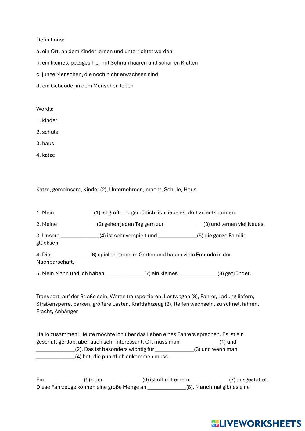 Created byAnna Lech Test in German vocab Age 13+ level: b1 German Author's Instructions My Google Classroom Courses × 0 classes selected (0 students total) Quick Access Select all classes (0 classes) All Classes Loading courses... Cancel Share Share to selected Course __COURSE_NAME__ __STUDENT_NAME__ (__STUDENT_EMAIL__) gERMAN Download Worksheet Validation Check my answers Emails my answers to my teacher Full name Group/level School subject Teacher's email or key code Close Submit Validating worksheet... (12) Your answers have been sent to your teacher. Good luck! OK We encountered an error submitting your answers. Please try again. OK Advertisement | Go Ad Free Created byAnna Lech Test in German vocab Age 13+ level: b1 German Author's Instructions