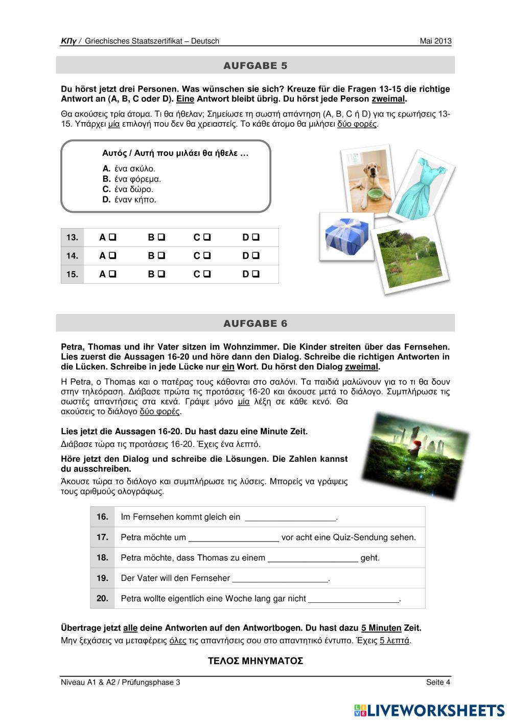 Created bysofia karataki DaF Hörverstehen Age 12+ level: A2 Greek (modern) Author's Instructions My Google Classroom Courses × 0 classes selected (0 students total) Quick Access Select all classes (0 classes) All Classes Loading courses... Cancel Share Share to selected Course __COURSE_NAME__ __STUDENT_NAME__ (__STUDENT_EMAIL__) KPG-A1-A2-Hörverstehen-2013 Download Worksheet Validation Check my answers Emails my answers to my teacher Full name Group/level School subject Teacher's email or key code Close Submit Validating worksheet... (12) Your answers have been sent to your teacher. Good luck! OK We encountered an error submitting your answers. Please try again. OK Advertisement | Go Ad Free Created bysofia karataki DaF Hörverstehen Age 12+ level: A2 Greek (modern) Author's Instructions