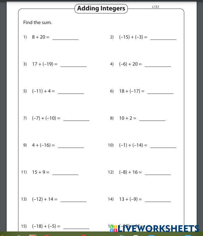 Created byLaskeLaske ALgebra Math Age 10+ level: High School English Author's Instructions My Google Classroom Courses × 0 classes selected (0 students total) Quick Access Select all classes (0 classes) All Classes Loading courses... Cancel Share Share to selected Course __COURSE_NAME__ __STUDENT_NAME__ (__STUDENT_EMAIL__) Adding Integers Download Worksheet Validation Check my answers Emails my answers to my teacher Full name Group/level School subject Teacher's email or key code Close Submit Validating worksheet... (12) Your answers have been sent to your teacher. Good luck! OK We encountered an error submitting your answers. Please try again. OK Advertisement | Go Ad Free Created byLaskeLaske ALgebra Math Age 10+ level: High School English Author's Instructions