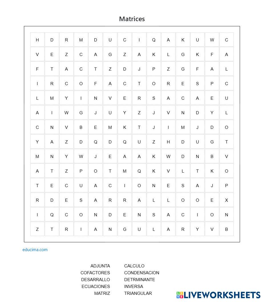 Created byJonathan Napoles Luna ALUMNO Matriz Age 18+ level: facil English Author's Instructions My Google Classroom Courses × 0 classes selected (0 students total) Quick Access Select all classes (0 classes) All Classes Loading courses... Cancel Share Share to selected Course __COURSE_NAME__ __STUDENT_NAME__ (__STUDENT_EMAIL__) sopa de letras de matriz Download Worksheet Validation Check my answers Emails my answers to my teacher Full name Group/level School subject Teacher's email or key code Close Submit Validating worksheet... (12) Your answers have been sent to your teacher. Good luck! OK We encountered an error submitting your answers. Please try again. OK Advertisement | Go Ad Free Created byJonathan Napoles Luna ALUMNO Matriz Age 18+ level: facil English Author's Instructions