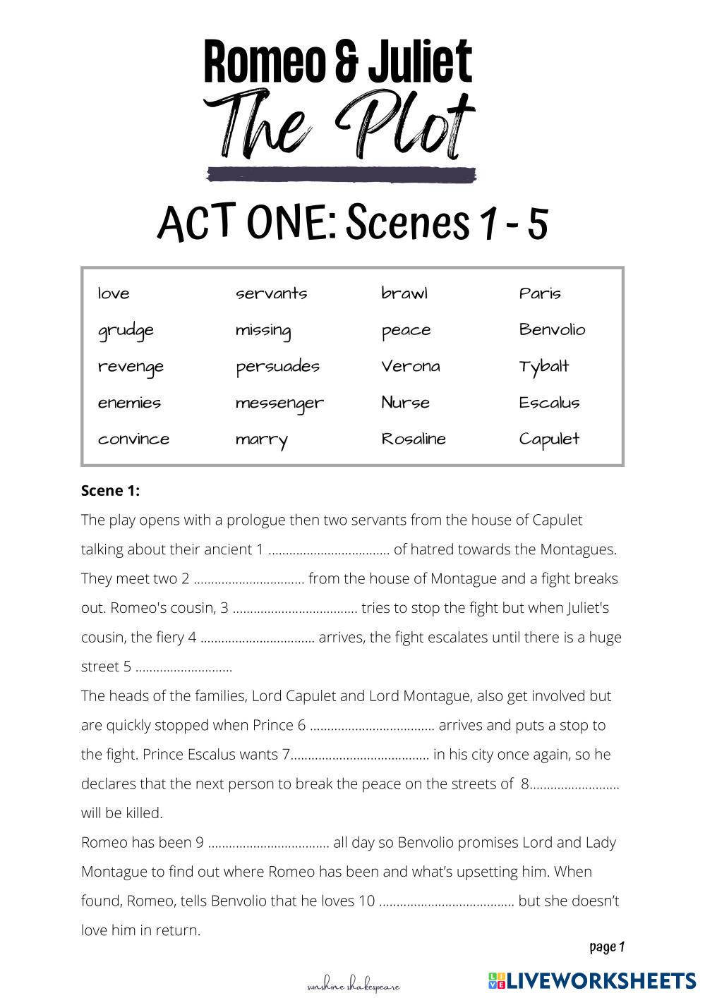 Worksheet to complete a cloze exercise summarizing the most important information about Act 1 from Romeo and Juliet.