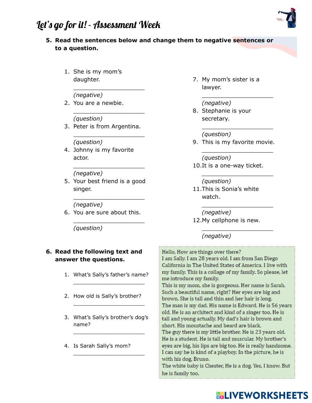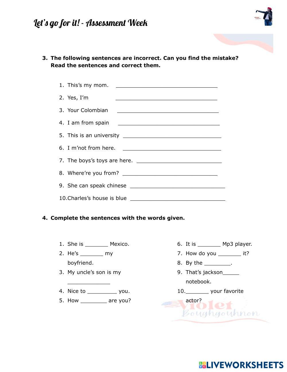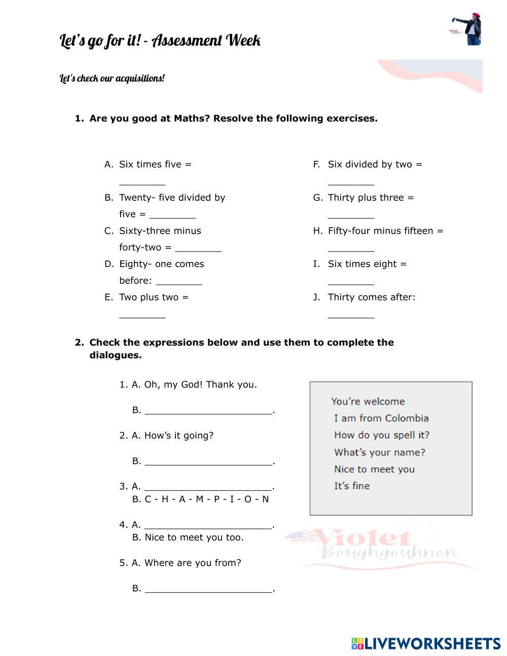 Created by VioleBoughgouhnon Assessment Assessment Age 12+ level: A1 English Author's Instructions My Google Classroom Courses × 0 classes selected (0 students total) Quick Access Select all classes (0 classes) All Classes Loading courses... Cancel Share Share to selected Course __COURSE_NAME__ __STUDENT_NAME__ (__STUDENT_EMAIL__) Assessment Test - A1.1 Download Worksheet Validation Check my answers Emails my answers to my teacher Full name Group/level School subject Teacher's email or key code Close Submit Validating worksheet... (12) Your answers have been sent to your teacher. Good luck! OK We encountered an error submitting your answers. Please try again. OK Advertisement | Go Ad Free Created by VioleBoughgouhnon Assessment Assessment Age 12+ level: A1 English Author's Instructions