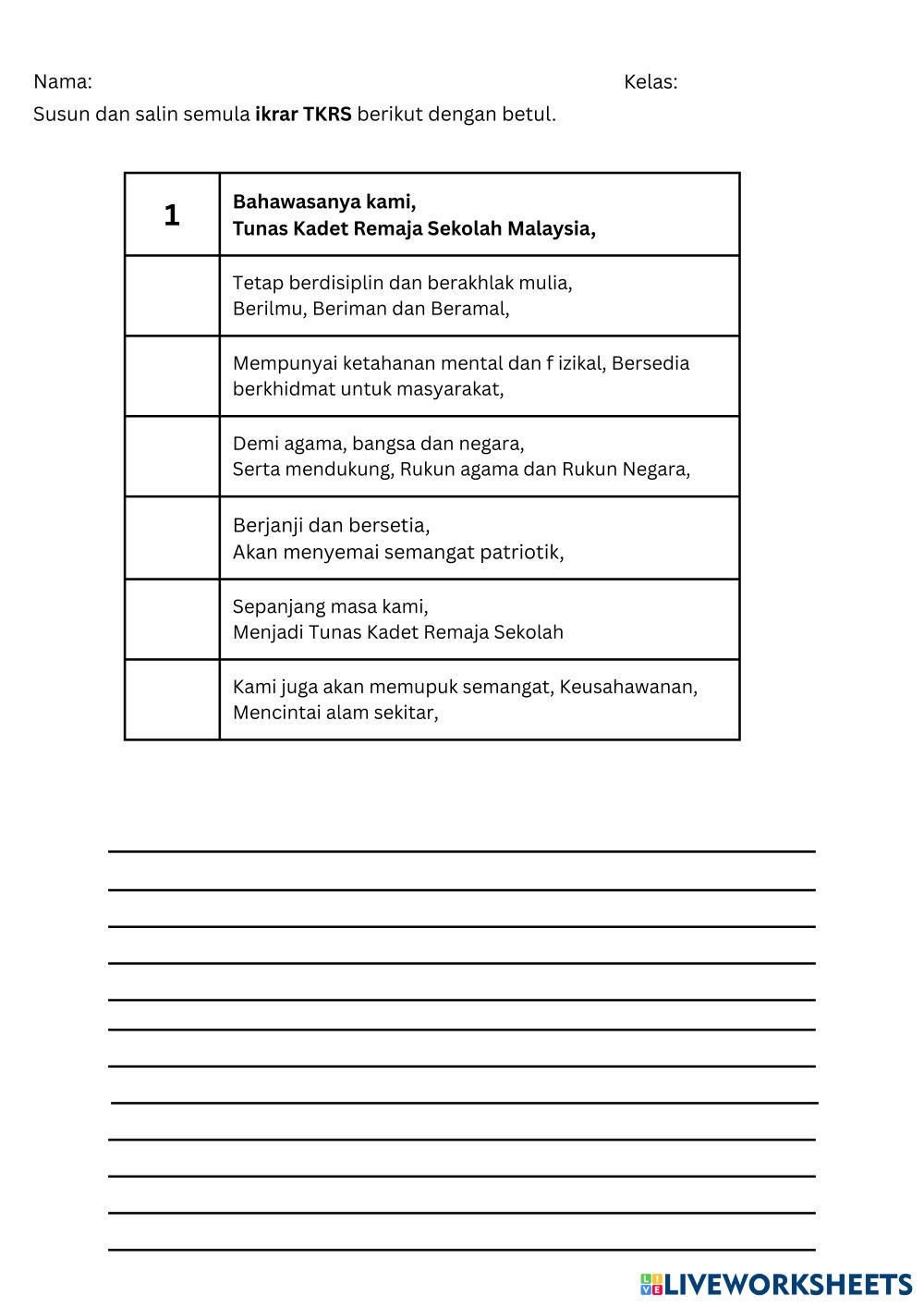 Created by Najwa000 Tunas Kadet Remaja Sekolah (TKRS) Unit Beruniform Age 10-15 level: YEAR 4 Malay Author's Instructions My Google Classroom Courses × 0 classes selected (0 students total) Quick Access Select all classes (0 classes) All Classes Loading courses... Cancel Share Share to selected Course __COURSE_NAME__ __STUDENT_NAME__ (__STUDENT_EMAIL__) IKRAR TKRS Download Worksheet Validation Check my answers Emails my answers to my teacher Full name Group/level School subject Teacher's email or key code Close Submit Validating worksheet... (12) Your answers have been sent to your teacher. Good luck! OK We encountered an error submitting your answers. Please try again. OK Advertisement | Go Ad Free Created by Najwa000 Tunas Kadet Remaja Sekolah (TKRS) Unit Beruniform Age 10-15 level: YEAR 4 Malay Author's Instructions