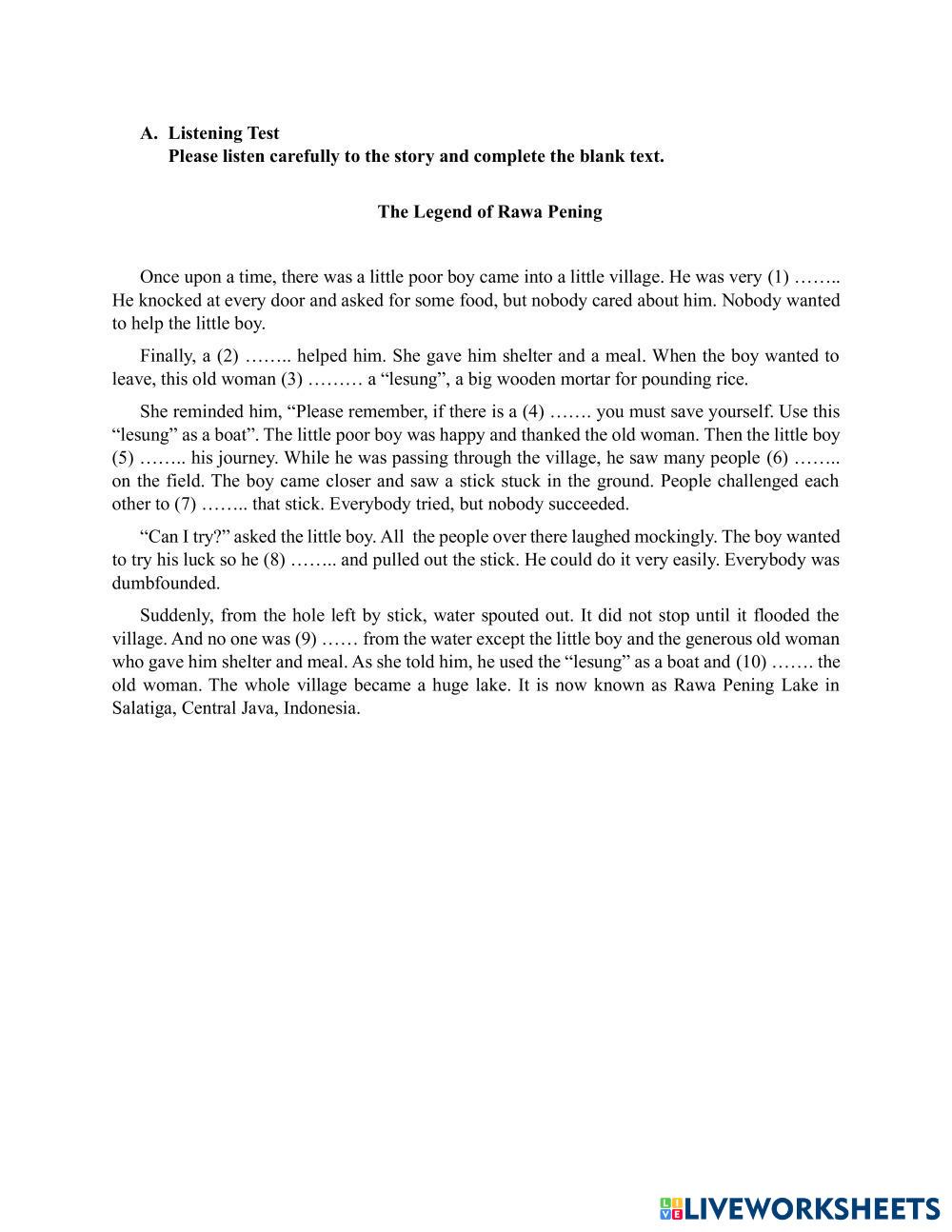 Created byDewi Krisna Y Bahasa Inggris Tingkat Lanjut - Age 16-15 level: Grade XI English Author's Instructions My Google Classroom Courses × 0 classes selected (0 students total) Quick Access Select all classes (0 classes) All Classes Loading courses... Cancel Share Share to selected Course __COURSE_NAME__ __STUDENT_NAME__ (__STUDENT_EMAIL__) Listening Test: Narrative Text (Legend) Download Worksheet Validation Check my answers Emails my answers to my teacher Full name Group/level School subject Teacher's email or key code Close Submit Validating worksheet... (12) Your answers have been sent to your teacher. Good luck! OK We encountered an error submitting your answers. Please try again. OK Advertisement | Go Ad Free Created byDewi Krisna Y Bahasa Inggris Tingkat Lanjut - Age 16-15 level: Grade XI English Author's Instructions