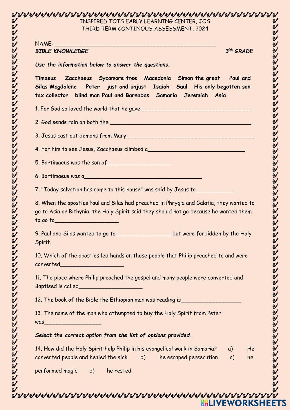 Created byMichael O. Ameh BIBLE KNOWLEDGE OBJECTIVE Age 7-14 level: 3RD GRADE English Author's Instructions My Google Classroom Courses × 0 classes selected (0 students total) Quick Access Select all classes (0 classes) All Classes Loading courses... Cancel Share Share to selected Course __COURSE_NAME__ __STUDENT_NAME__ (__STUDENT_EMAIL__) INSPIRED TOTS EARLY LEARNING CENTER, JOS Download Worksheet Validation Check my answers Emails my answers to my teacher Full name Group/level School subject Teacher's email or key code Close Submit Validating worksheet... (12) Your answers have been sent to your teacher. Good luck! OK We encountered an error submitting your answers. Please try again. OK Advertisement | Go Ad Free Created byMichael O. Ameh BIBLE KNOWLEDGE OBJECTIVE Age 7-14 level: 3RD GRADE English Author's Instructions