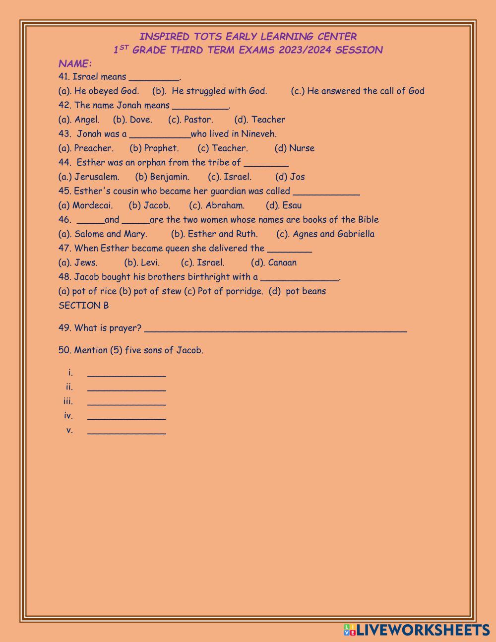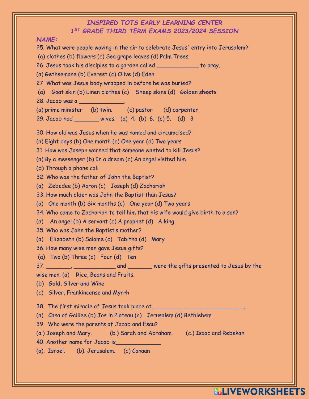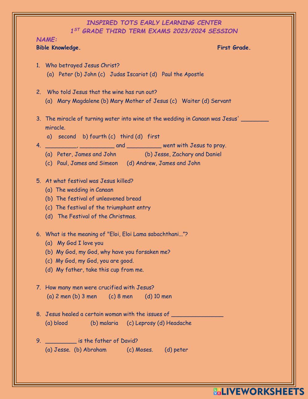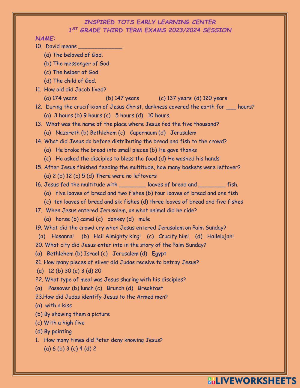 Created byFaith Ochanya Adonyikwu BIBLE KNOWLEDGE The story of David. Age 6-10 level: First Grade English Author's Instructions My Google Classroom Courses × 0 classes selected (0 students total) Quick Access Select all classes (0 classes) All Classes Loading courses... Cancel Share Share to selected Course __COURSE_NAME__ __STUDENT_NAME__ (__STUDENT_EMAIL__) INSPIRED TOTS EARLY LEARNING CENTER SECOND TERM EXAMINATION 2023/2024SESSION Download Worksheet Validation Check my answers Emails my answers to my teacher Full name Group/level School subject Teacher's email or key code Close Submit Validating worksheet... (12) Your answers have been sent to your teacher. Good luck! OK We encountered an error submitting your answers. Please try again. OK Advertisement | Go Ad Free Created byFaith Ochanya Adonyikwu BIBLE KNOWLEDGE The story of David. Age 6-10 level: First Grade English Author's Instructions
