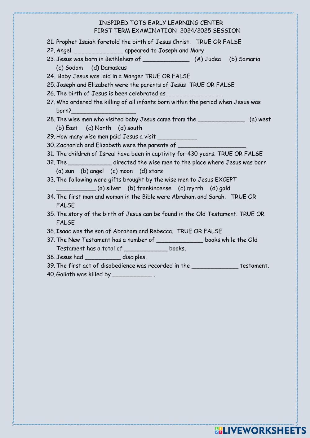 Created byLevi Nwachukwu Bible Knowledge Adam and Eve Age 8-13 level: 4TH GRADE English Author's Instructions My Google Classroom Courses × 0 classes selected (0 students total) Quick Access Select all classes (0 classes) All Classes Loading courses... Cancel Share Share to selected Course __COURSE_NAME__ __STUDENT_NAME__ (__STUDENT_EMAIL__) INSPIRED TOTS EARLY LEARNING CENTER Download Worksheet Validation Check my answers Emails my answers to my teacher Full name Group/level School subject Teacher's email or key code Close Submit Validating worksheet... (12) Your answers have been sent to your teacher. Good luck! OK We encountered an error submitting your answers. Please try again. OK Advertisement | Go Ad Free Created byLevi Nwachukwu Bible Knowledge Adam and Eve Age 8-13 level: 4TH GRADE English Author's Instructions
