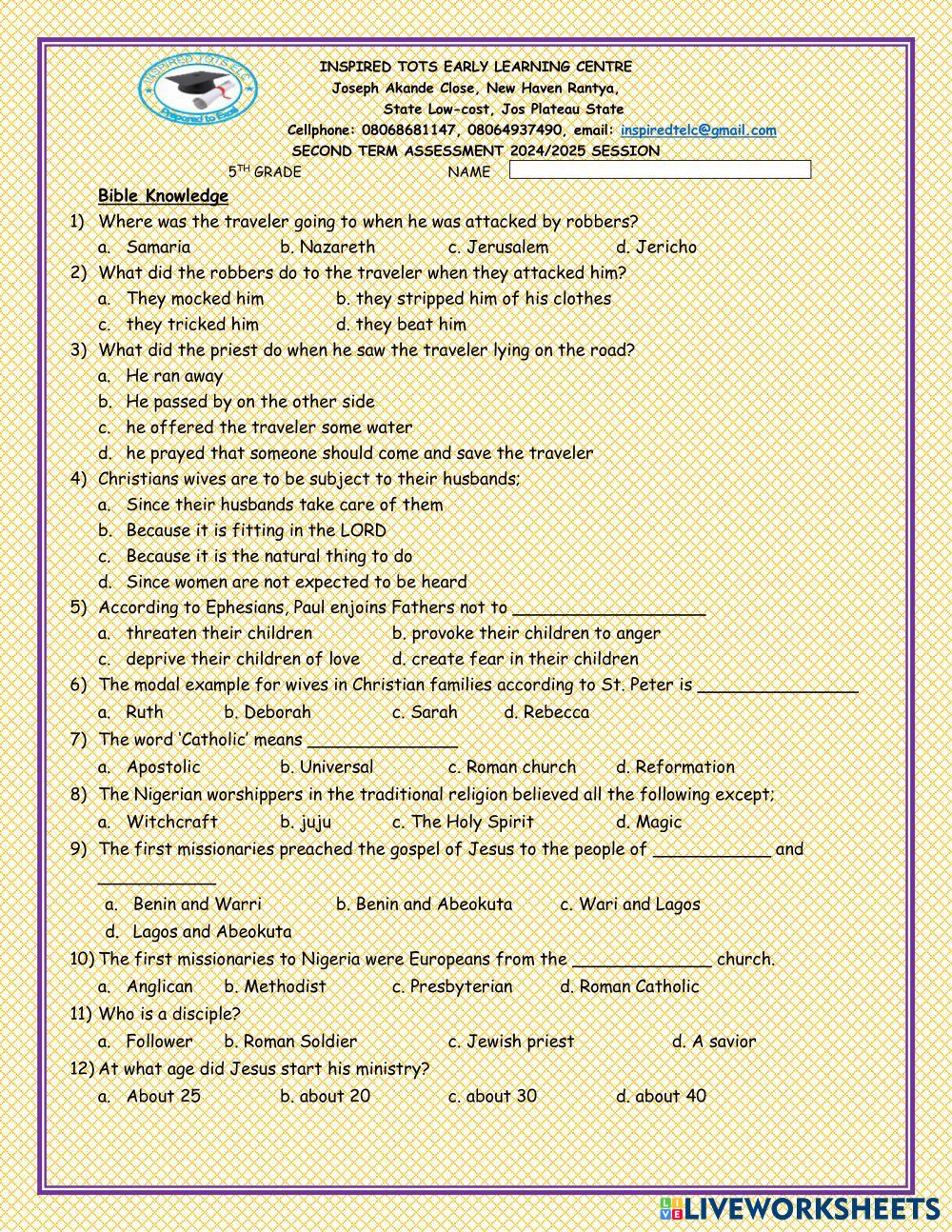 Created byMusa David Zoaka Bible Knowledge CHURCH HISTORY Age 9-14 level: 5TH GRADE English Author's Instructions My Google Classroom Courses × 0 classes selected (0 students total) Quick Access Select all classes (0 classes) All Classes Loading courses... Cancel Share Share to selected Course __COURSE_NAME__ __STUDENT_NAME__ (__STUDENT_EMAIL__) INSPIRED TOTS EARLY LEARNING CENTRE RANTIYA JOS Download Worksheet Validation Check my answers Emails my answers to my teacher Full name Group/level School subject Teacher's email or key code Close Submit Validating worksheet... (12) Your answers have been sent to your teacher. Good luck! OK We encountered an error submitting your answers. Please try again. OK Advertisement | Go Ad Free Created byMusa David Zoaka Bible Knowledge CHURCH HISTORY Age 9-14 level: 5TH GRADE English Author's Instructions