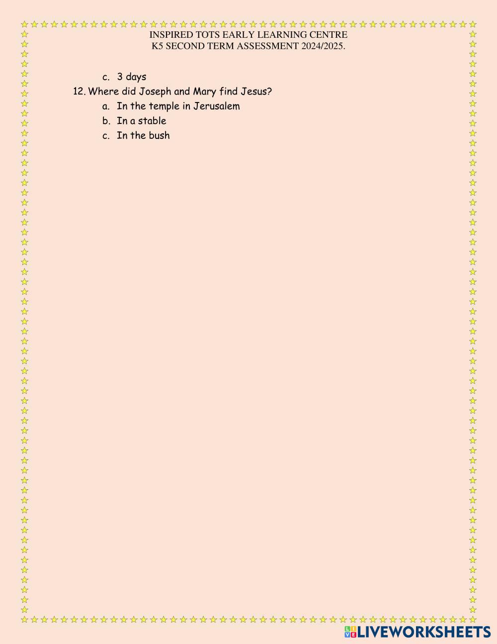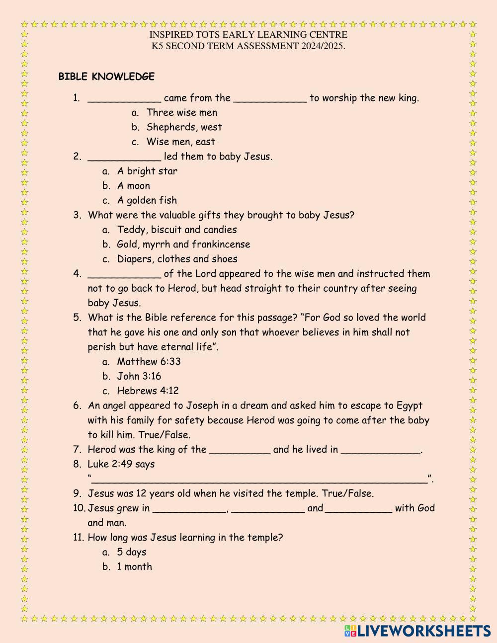 Created byGani Dorcas Bible Knowledge The visist to the temple Age 5-6 level: K5 English Author's Instructions My Google Classroom Courses × 0 classes selected (0 students total) Quick Access Select all classes (0 classes) All Classes Loading courses... Cancel Share Share to selected Course __COURSE_NAME__ __STUDENT_NAME__ (__STUDENT_EMAIL__) Inspired tots elc Download Worksheet Validation Check my answers Emails my answers to my teacher Full name Group/level School subject Teacher's email or key code Close Submit Validating worksheet... (12) Your answers have been sent to your teacher. Good luck! OK We encountered an error submitting your answers. Please try again. OK Advertisement | Go Ad Free Created byGani Dorcas Bible Knowledge The visist to the temple Age 5-6 level: K5 English Author's Instructions
