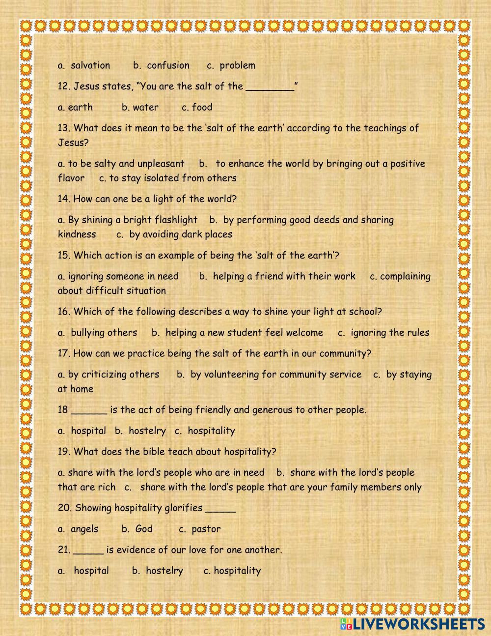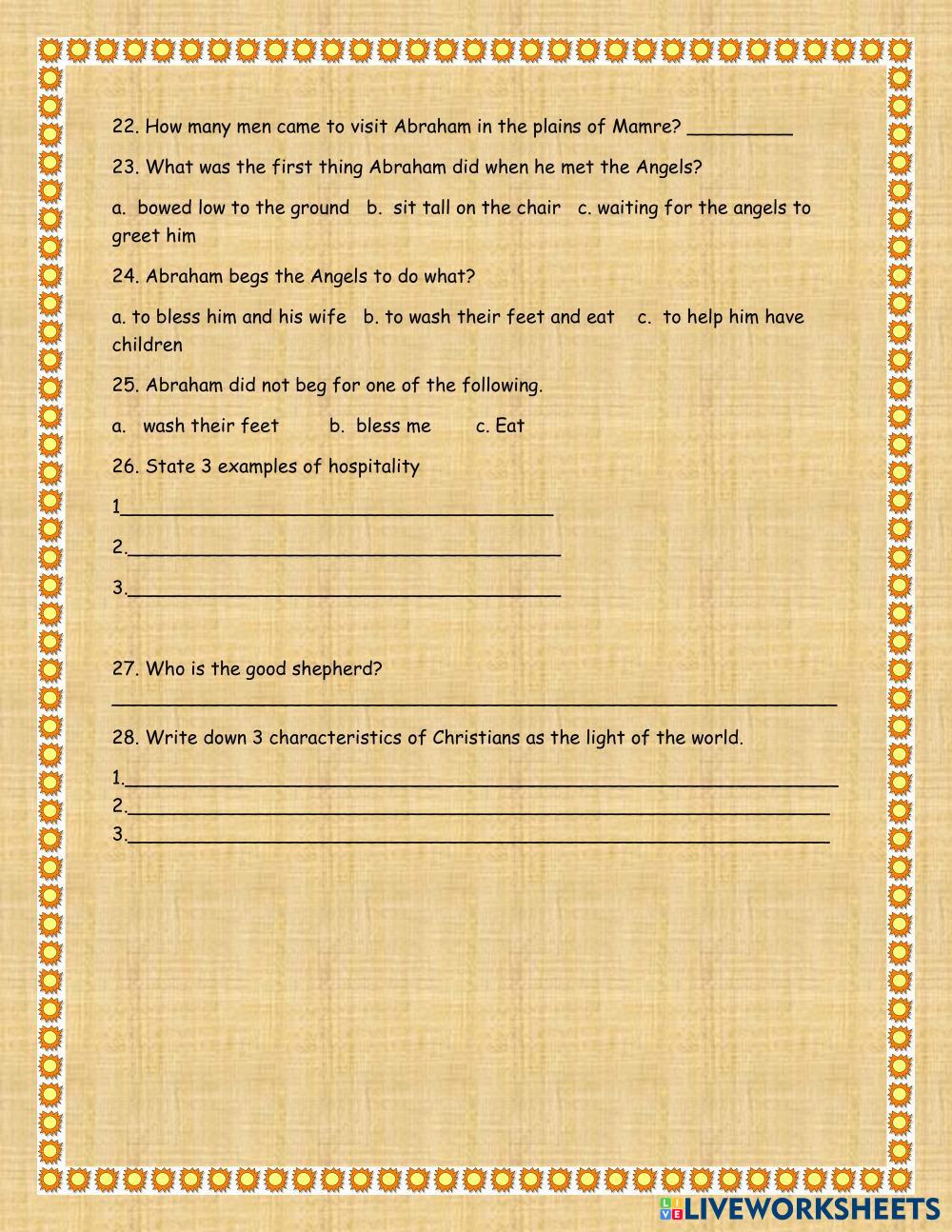 Created by Gweni_Comfort2023 Bible Knowledge The Good Shepherd Age 7-11 level: 2 grade English Author's Instructions My Google Classroom Courses × 0 classes selected (0 students total) Quick Access Select all classes (0 classes) All Classes Loading courses... Cancel Share Share to selected Course __COURSE_NAME__ __STUDENT_NAME__ (__STUDENT_EMAIL__) Inspired Tots Early Learning Center Download Worksheet Validation Check my answers Emails my answers to my teacher Full name Group/level School subject Teacher's email or key code Close Submit Validating worksheet... (12) Your answers have been sent to your teacher. Good luck! OK We encountered an error submitting your answers. Please try again. OK Advertisement | Go Ad Free Created by Gweni_Comfort2023 Bible Knowledge The Good Shepherd Age 7-11 level: 2 grade English Author's Instructions