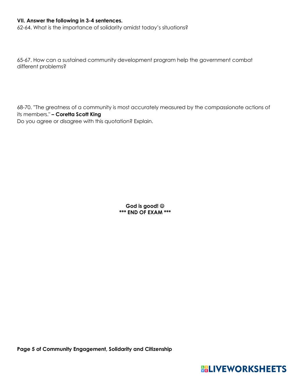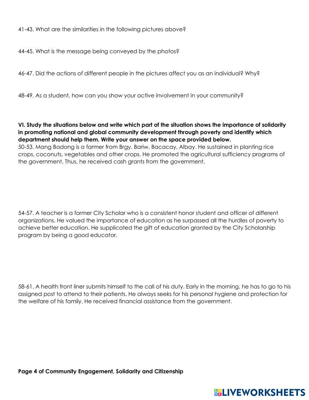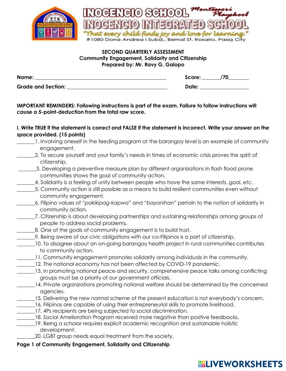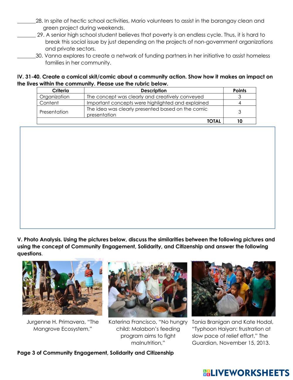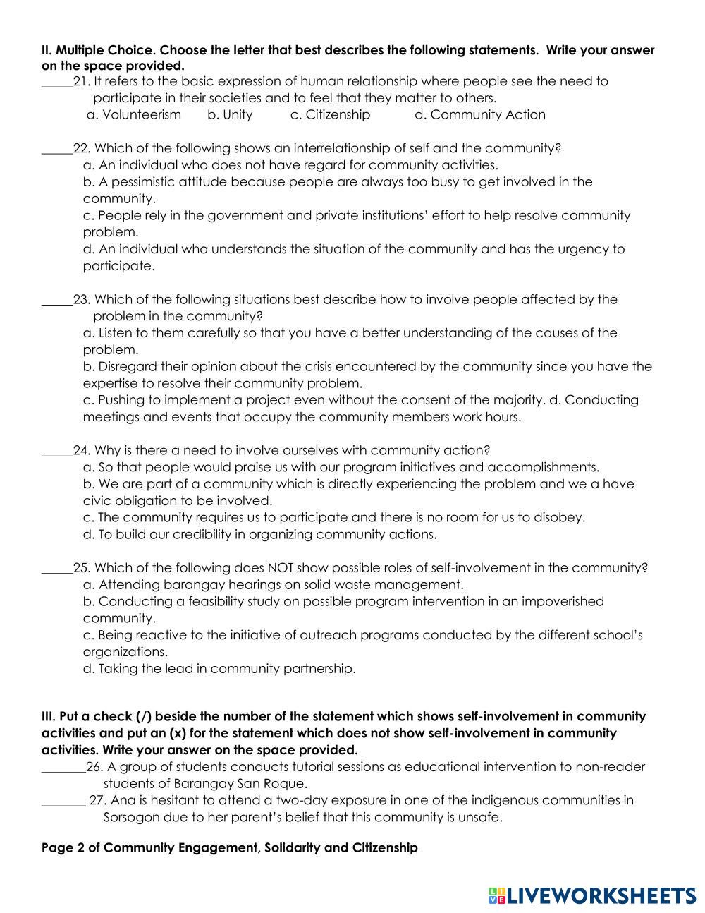 Created byRavy Galopo Community Engagement Community Engagement Age 16+ level: Grade 11 English Author's Instructions My Google Classroom Courses × 0 classes selected (0 students total) Quick Access Select all classes (0 classes) All Classes Loading courses... Cancel Share Share to selected Course __COURSE_NAME__ __STUDENT_NAME__ (__STUDENT_EMAIL__) Community Engagement Download Worksheet Validation Check my answers Emails my answers to my teacher Full name Group/level School subject Teacher's email or key code Close Submit Validating worksheet... (12) Your answers have been sent to your teacher. Good luck! OK We encountered an error submitting your answers. Please try again. OK Advertisement | Go Ad Free Created byRavy Galopo Community Engagement Community Engagement Age 16+ level: Grade 11 English Author's Instructions