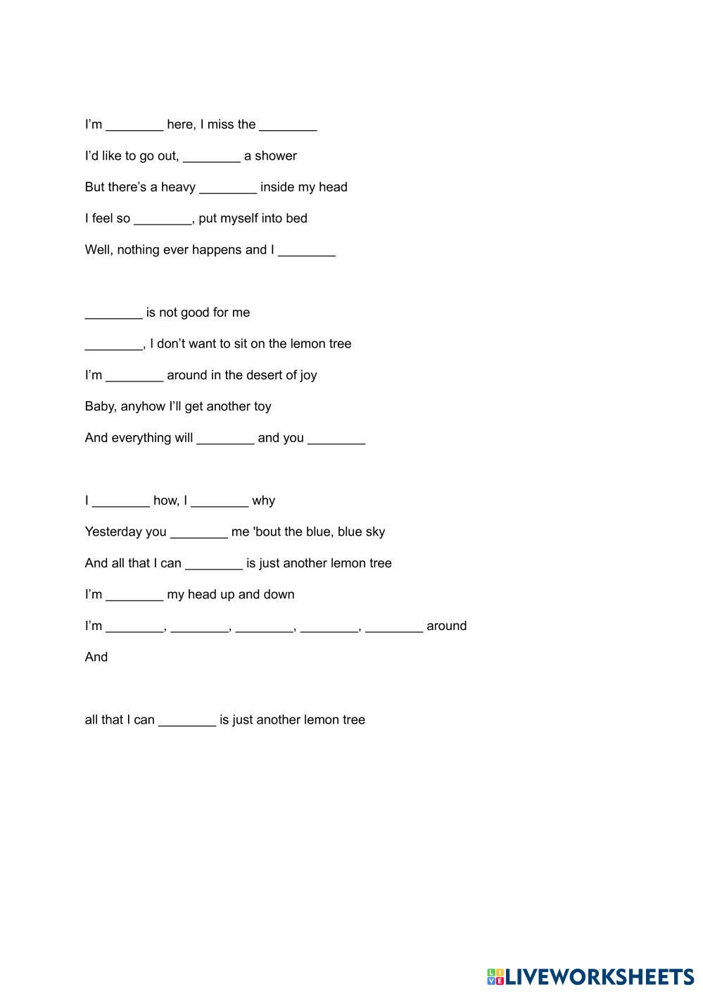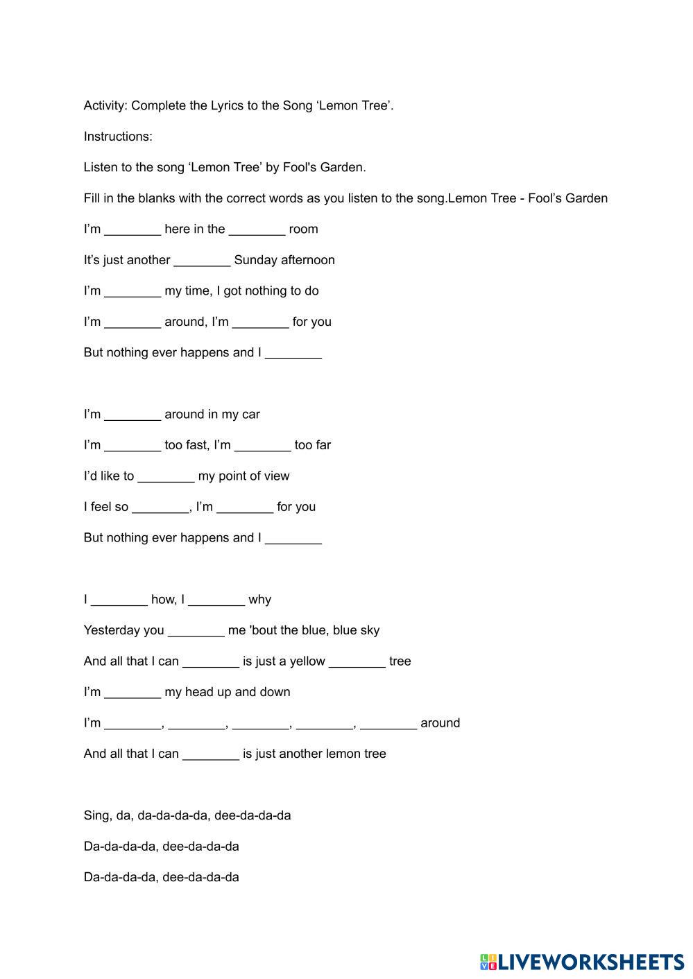 Created byYissela Estefano Complete fill the blank Listen to the song ‘Lemon Tree’ by Fool's Garden. Age 10+ level: B1 English Author's Instructions My Google Classroom Courses × 0 classes selected (0 students total) Quick Access Select all classes (0 classes) All Classes Loading courses... Cancel Share Share to selected Course __COURSE_NAME__ __STUDENT_NAME__ (__STUDENT_EMAIL__) ACTIVITY LISTENING Download Worksheet Validation Check my answers Emails my answers to my teacher Full name Group/level School subject Teacher's email or key code Close Submit Validating worksheet... (12) Your answers have been sent to your teacher. Good luck! OK We encountered an error submitting your answers. Please try again. OK Advertisement | Go Ad Free Created byYissela Estefano Complete fill the blank Listen to the song ‘Lemon Tree’ by Fool's Garden. Age 10+ level: B1 English Author's Instructions