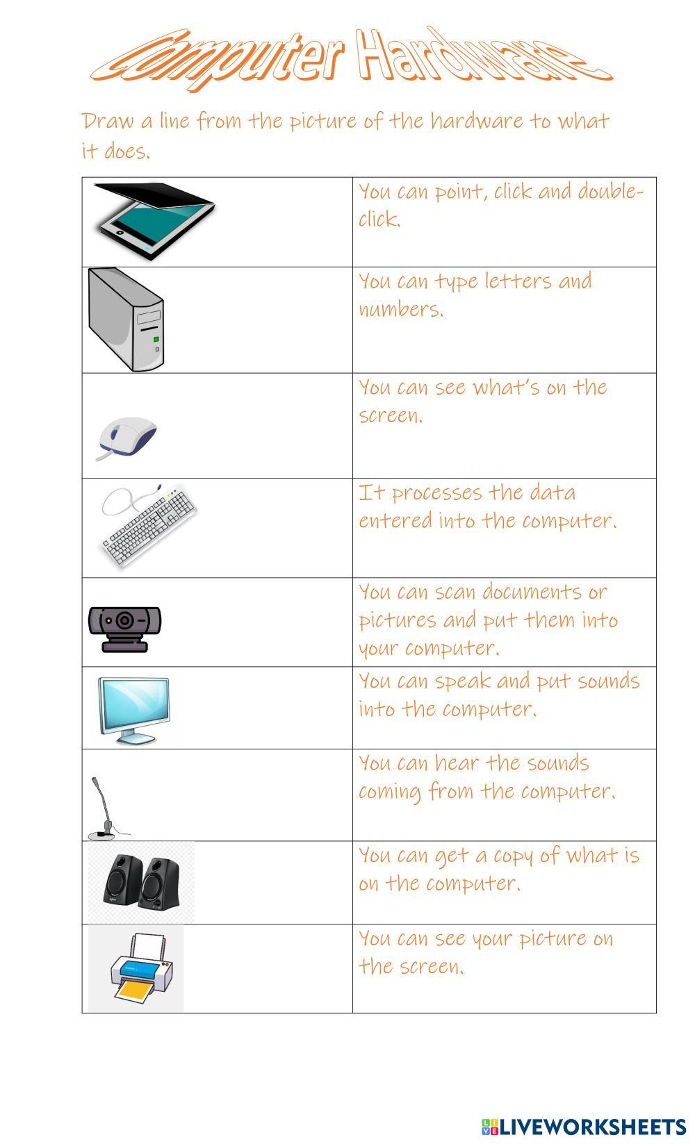 Created by MrsMaycock Computer Computer hardware Age 4-18 level: 2 English Author's Instructions My Google Classroom Courses × 0 classes selected (0 students total) Quick Access Select all classes (0 classes) All Classes Loading courses... Cancel Share Share to selected Course __COURSE_NAME__ __STUDENT_NAME__ (__STUDENT_EMAIL__) Computer Hardware Match 2 Download Worksheet Validation Check my answers Emails my answers to my teacher Full name Group/level School subject Teacher's email or key code Close Submit Validating worksheet... (12) Your answers have been sent to your teacher. Good luck! OK We encountered an error submitting your answers. Please try again. OK Advertisement | Go Ad Free Created by MrsMaycock Computer Computer hardware Age 4-18 level: 2 English Author's Instructions