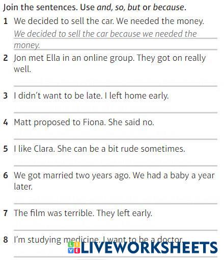 Created byIvon Vanessa Oliveros Manjarres Conjunctions so, because, and, but Age 18-16 level: a1 English Author's Instructions My Google Classroom Courses × 0 classes selected (0 students total) Quick Access Select all classes (0 classes) All Classes Loading courses... Cancel Share Share to selected Course __COURSE_NAME__ __STUDENT_NAME__ (__STUDENT_EMAIL__) Sentences with so, because, but, and Download Worksheet Validation Check my answers Emails my answers to my teacher Full name Group/level School subject Teacher's email or key code Close Submit Validating worksheet... (12) Your answers have been sent to your teacher. Good luck! OK We encountered an error submitting your answers. Please try again. OK Advertisement | Go Ad Free Created byIvon Vanessa Oliveros Manjarres Conjunctions so, because, and, but Age 18-16 level: a1 English Author's Instructions