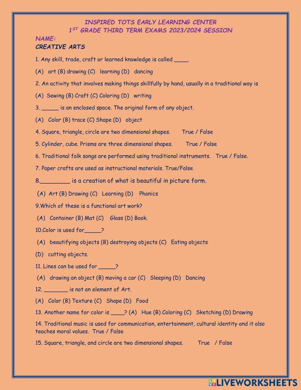 Created byFaith Ochanya Adonyikwu Creative Arts Music Age 6-10 level: FIRST GRADE English Author's Instructions My Google Classroom Courses × 0 classes selected (0 students total) Quick Access Select all classes (0 classes) All Classes Loading courses... Cancel Share Share to selected Course __COURSE_NAME__ __STUDENT_NAME__ (__STUDENT_EMAIL__) INSPIRED TOTS EARLY LEARNING CENTER SECOND TERM EXAMINATION 2023/2024SESSION Download Worksheet Validation Check my answers Emails my answers to my teacher Full name Group/level School subject Teacher's email or key code Close Submit Validating worksheet... (12) Your answers have been sent to your teacher. Good luck! OK We encountered an error submitting your answers. Please try again. OK Advertisement | Go Ad Free Created byFaith Ochanya Adonyikwu Creative Arts Music Age 6-10 level: FIRST GRADE English Author's Instructions