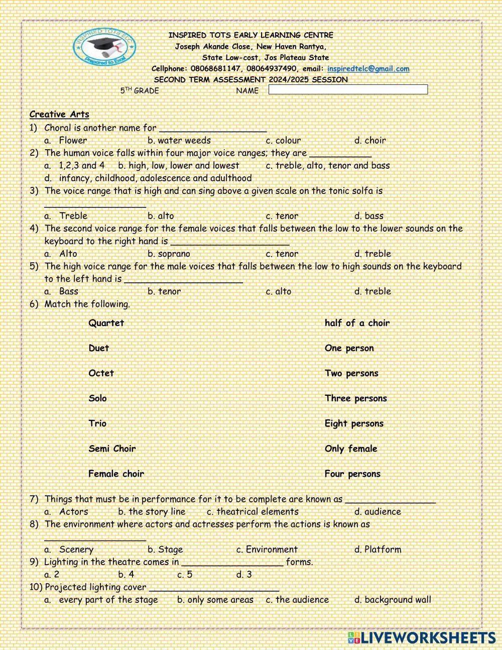 Created byMusa David Zoaka Creative Arts CHORAL SINGING Age 9-13 level: 5TH GRADE English Author's Instructions My Google Classroom Courses × 0 classes selected (0 students total) Quick Access Select all classes (0 classes) All Classes Loading courses... Cancel Share Share to selected Course __COURSE_NAME__ __STUDENT_NAME__ (__STUDENT_EMAIL__) INSPIRED TOTS EARLY LEARNING CENTRE RANTIYA JOS Download Worksheet Validation Check my answers Emails my answers to my teacher Full name Group/level School subject Teacher's email or key code Close Submit Validating worksheet... (12) Your answers have been sent to your teacher. Good luck! OK We encountered an error submitting your answers. Please try again. OK Advertisement | Go Ad Free Created byMusa David Zoaka Creative Arts CHORAL SINGING Age 9-13 level: 5TH GRADE English Author's Instructions