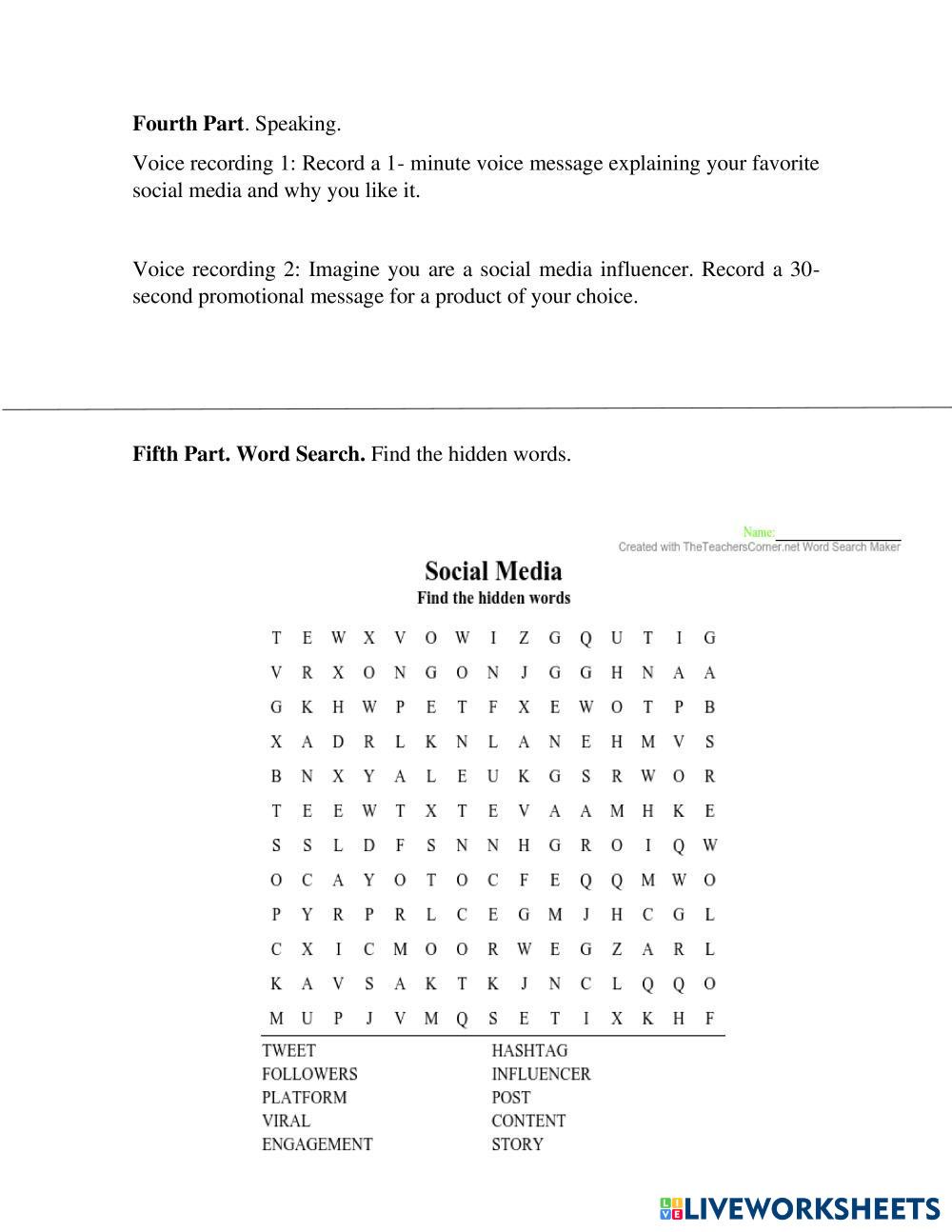 Created byEdwin Eduardo Larios Cuevas Educational Technology Vocabulary Age 12+ level: Intermediate English Author's Instructions My Google Classroom Courses × 0 classes selected (0 students total) Quick Access Select all classes (0 classes) All Classes Loading courses... Cancel Share Share to selected Course __COURSE_NAME__ __STUDENT_NAME__ (__STUDENT_EMAIL__) Social Media - Worksheet Download Worksheet Validation Check my answers Emails my answers to my teacher Full name Group/level School subject Teacher's email or key code Close Submit Validating worksheet... (12) Your answers have been sent to your teacher. Good luck! OK We encountered an error submitting your answers. Please try again. OK Advertisement | Go Ad Free Created byEdwin Eduardo Larios Cuevas Educational Technology Vocabulary Age 12+ level: Intermediate English Author's Instructions