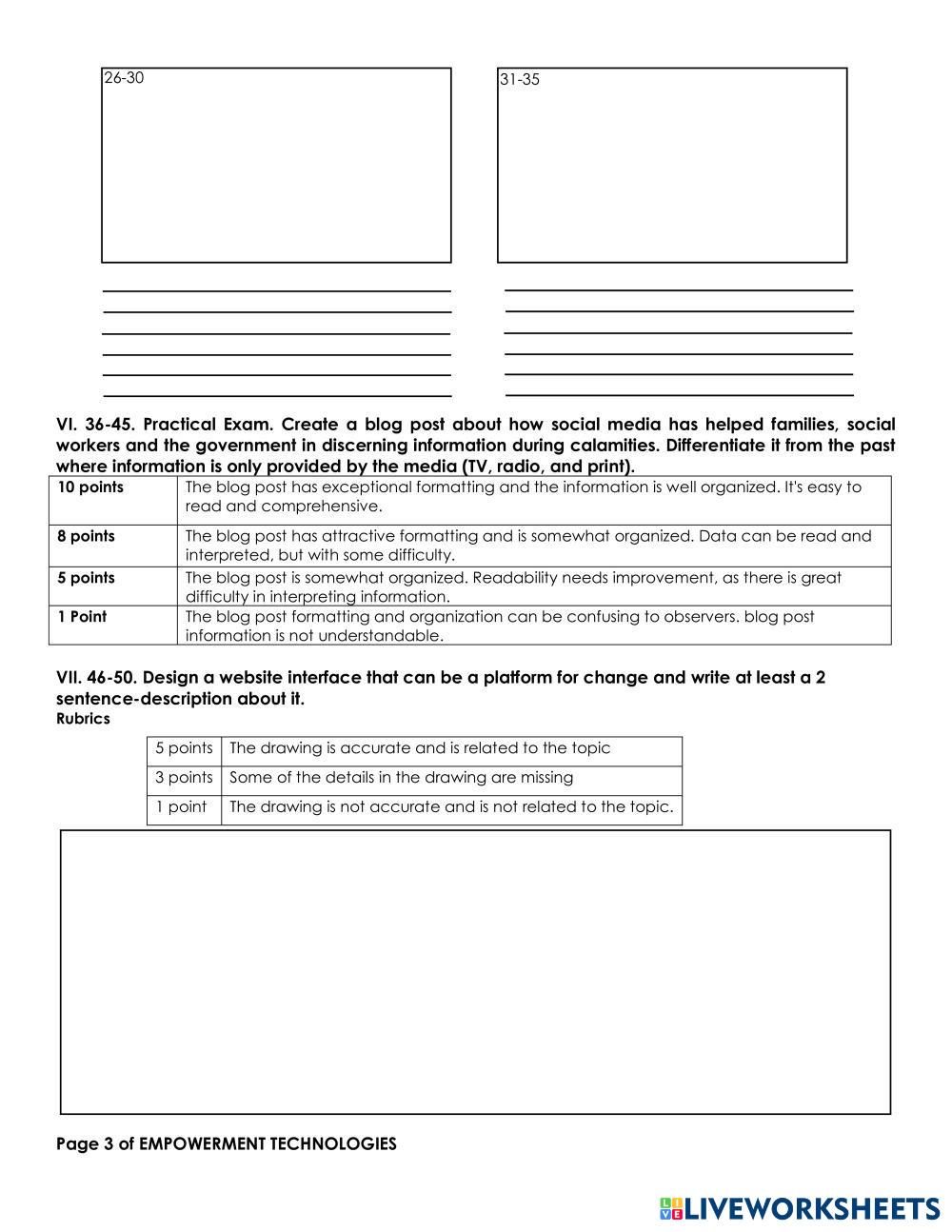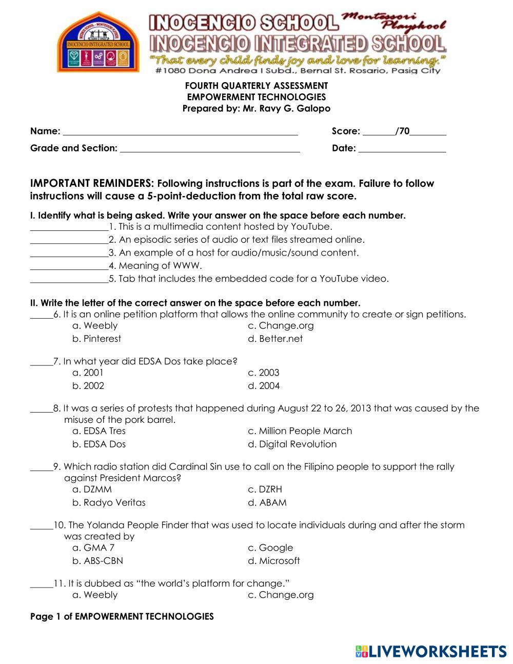 Created byRavy Galopo Empowerment Technology Technology Age 18+ level: 11 English Author's Instructions My Google Classroom Courses × 0 classes selected (0 students total) Quick Access Select all classes (0 classes) All Classes Loading courses... Cancel Share Share to selected Course __COURSE_NAME__ __STUDENT_NAME__ (__STUDENT_EMAIL__) EMTECH Download Worksheet Validation Check my answers Emails my answers to my teacher Full name Group/level School subject Teacher's email or key code Close Submit Validating worksheet... (12) Your answers have been sent to your teacher. Good luck! OK We encountered an error submitting your answers. Please try again. OK Advertisement | Go Ad Free Created byRavy Galopo Empowerment Technology Technology Age 18+ level: 11 English Author's Instructions