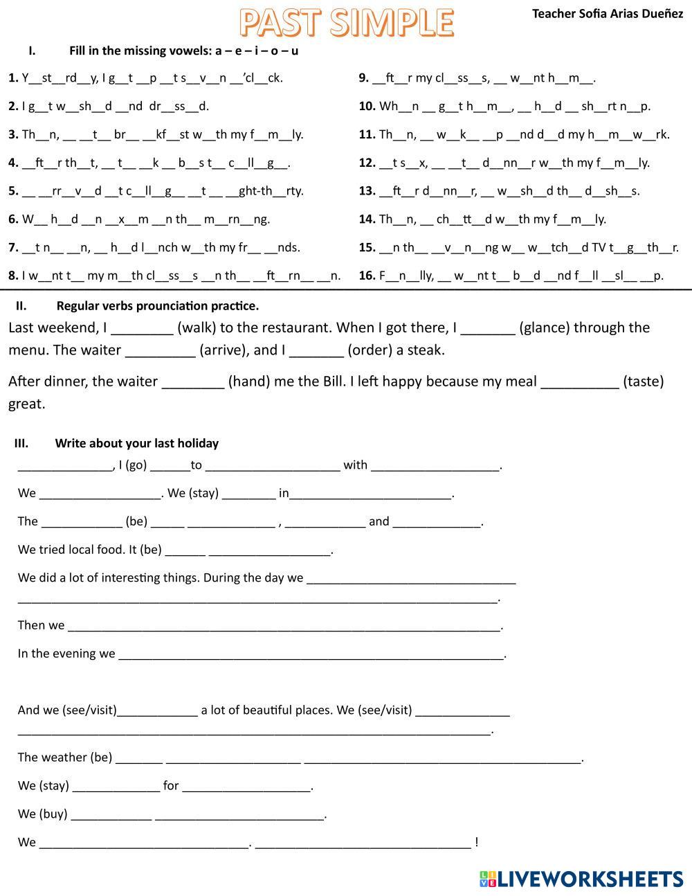 Created bySofia Arias Engliash as a second language Daily routine in past simple Age 10+ level: A1-A2 English Author's Instructions My Google Classroom Courses × 0 classes selected (0 students total) Quick Access Select all classes (0 classes) All Classes Loading courses... Cancel Share Share to selected Course __COURSE_NAME__ __STUDENT_NAME__ (__STUDENT_EMAIL__) Past simple - spelling routine Download Worksheet Validation Check my answers Emails my answers to my teacher Full name Group/level School subject Teacher's email or key code Close Submit Validating worksheet... (12) Your answers have been sent to your teacher. Good luck! OK We encountered an error submitting your answers. Please try again. OK Advertisement | Go Ad Free Created bySofia Arias Engliash as a second language Daily routine in past simple Age 10+ level: A1-A2 English Author's Instructions