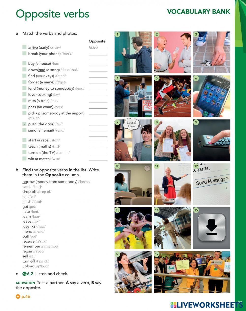 Created by Laura910 English B1 Grammar & Vocabulary Age 18+ level: B1 English Author's Instructions My Google Classroom Courses × 0 classes selected (0 students total) Quick Access Select all classes (0 classes) All Classes Loading courses... Cancel Share Share to selected Course __COURSE_NAME__ __STUDENT_NAME__ (__STUDENT_EMAIL__) Homework: Grammar & Vocabulary Download Worksheet Validation Check my answers Emails my answers to my teacher Full name Group/level School subject Teacher's email or key code Close Submit Validating worksheet... (12) Your answers have been sent to your teacher. Good luck! OK We encountered an error submitting your answers. Please try again. OK Advertisement | Go Ad Free Created by Laura910 English B1 Grammar & Vocabulary Age 18+ level: B1 English Author's Instructions