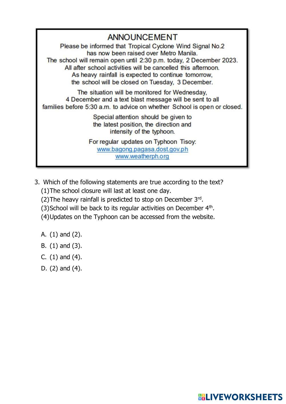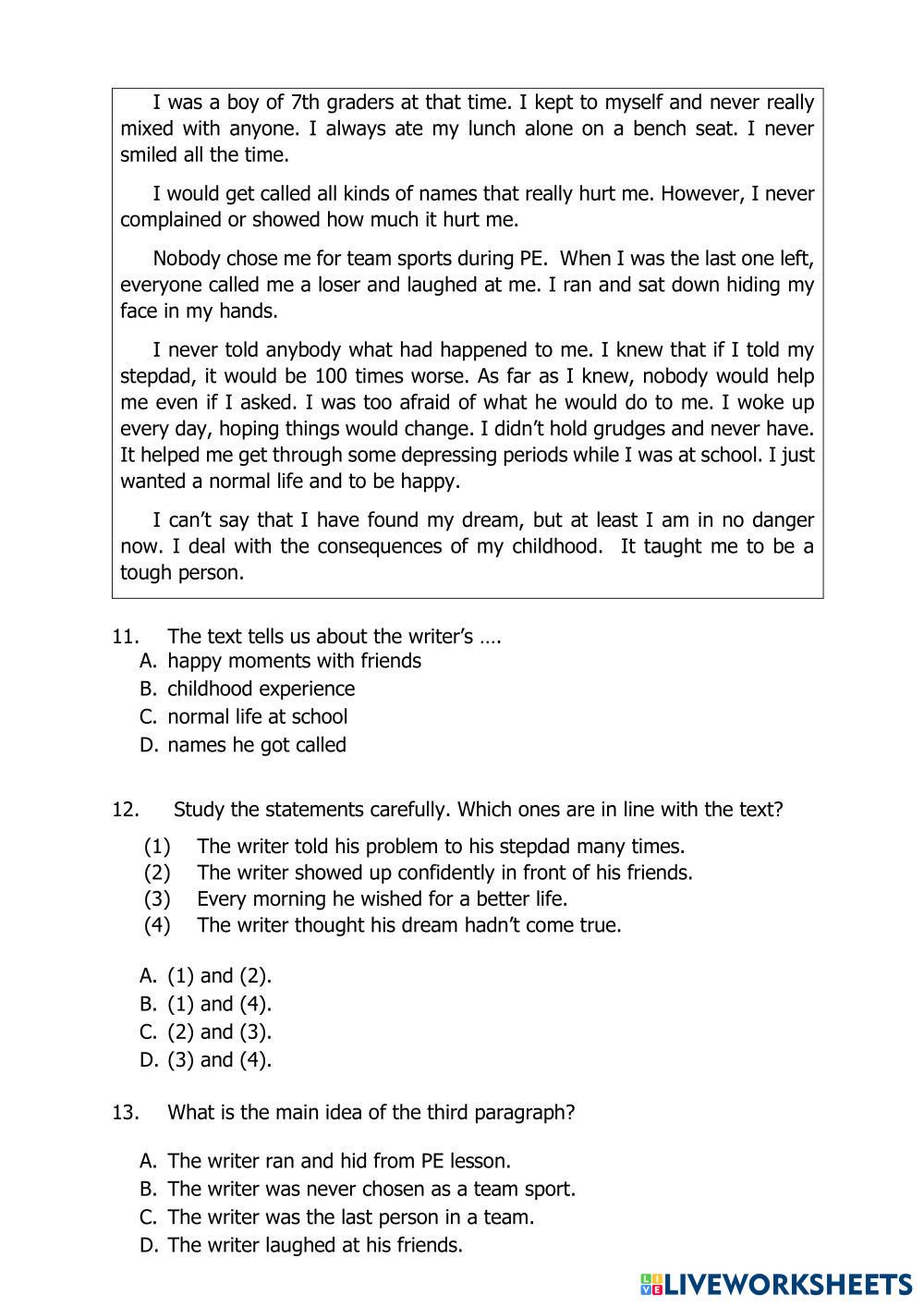 Created by Pramesti English as a Foreign Language (EFL) Reading comprehension Age 14+ level: 9 English Author's Instructions My Google Classroom Courses × 0 classes selected (0 students total) Quick Access Select all classes (0 classes) All Classes Loading courses... Cancel Share Share to selected Course __COURSE_NAME__ __STUDENT_NAME__ (__STUDENT_EMAIL__) PPMAD Bahasa Inggris Kelas 9 #4 Download Worksheet Validation Check my answers Emails my answers to my teacher Full name Group/level School subject Teacher's email or key code Close Submit Validating worksheet... (12) Your answers have been sent to your teacher. Good luck! OK We encountered an error submitting your answers. Please try again. OK Advertisement | Go Ad Free Created by Pramesti English as a Foreign Language (EFL) Reading comprehension Age 14+ level: 9 English Author's Instructions