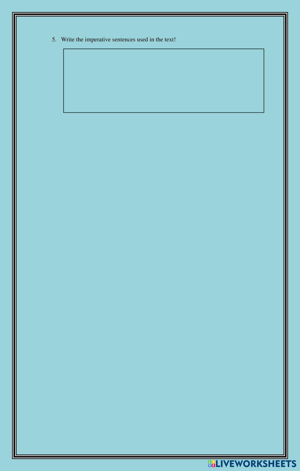 Created byCandra English as a Foreign Language (EFL) Procedure text Age 13-14 level: 8 English Author's Instructions My Google Classroom Courses × 0 classes selected (0 students total) Quick Access Select all classes (0 classes) All Classes Loading courses... Cancel Share Share to selected Course __COURSE_NAME__ __STUDENT_NAME__ (__STUDENT_EMAIL__) Read/Write Learners Worksheet Procedure Text Download Worksheet Validation Check my answers Emails my answers to my teacher Full name Group/level School subject Teacher's email or key code Close Submit Validating worksheet... (12) Your answers have been sent to your teacher. Good luck! OK We encountered an error submitting your answers. Please try again. OK Advertisement | Go Ad Free Created byCandra English as a Foreign Language (EFL) Procedure text Age 13-14 level: 8 English Author's Instructions