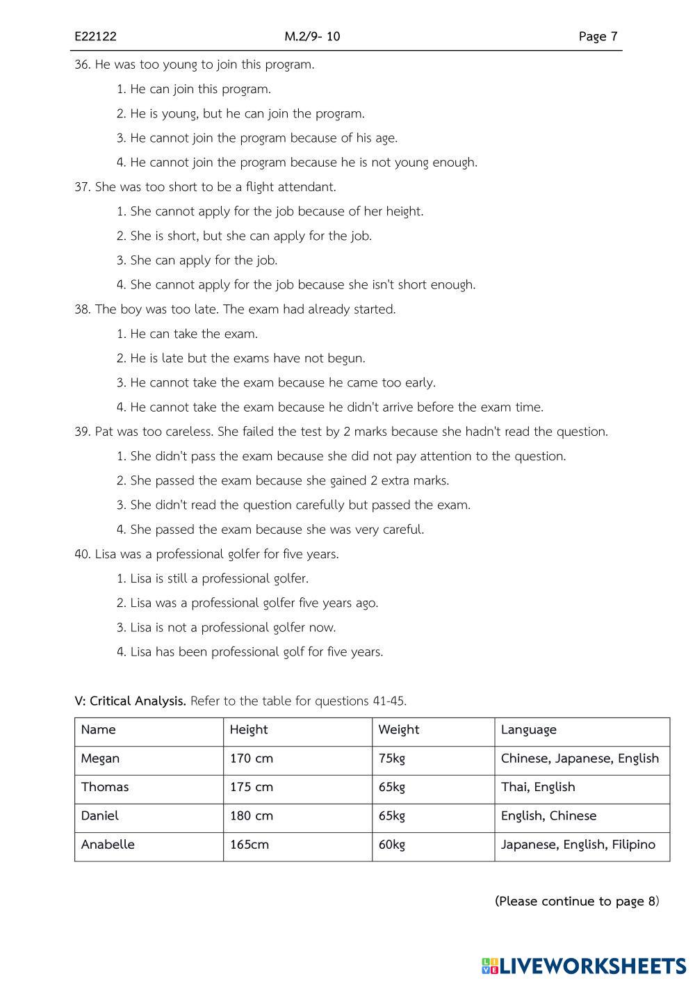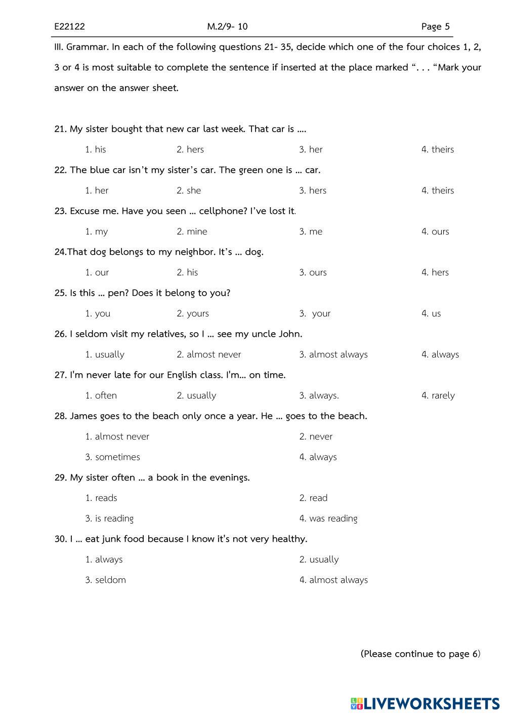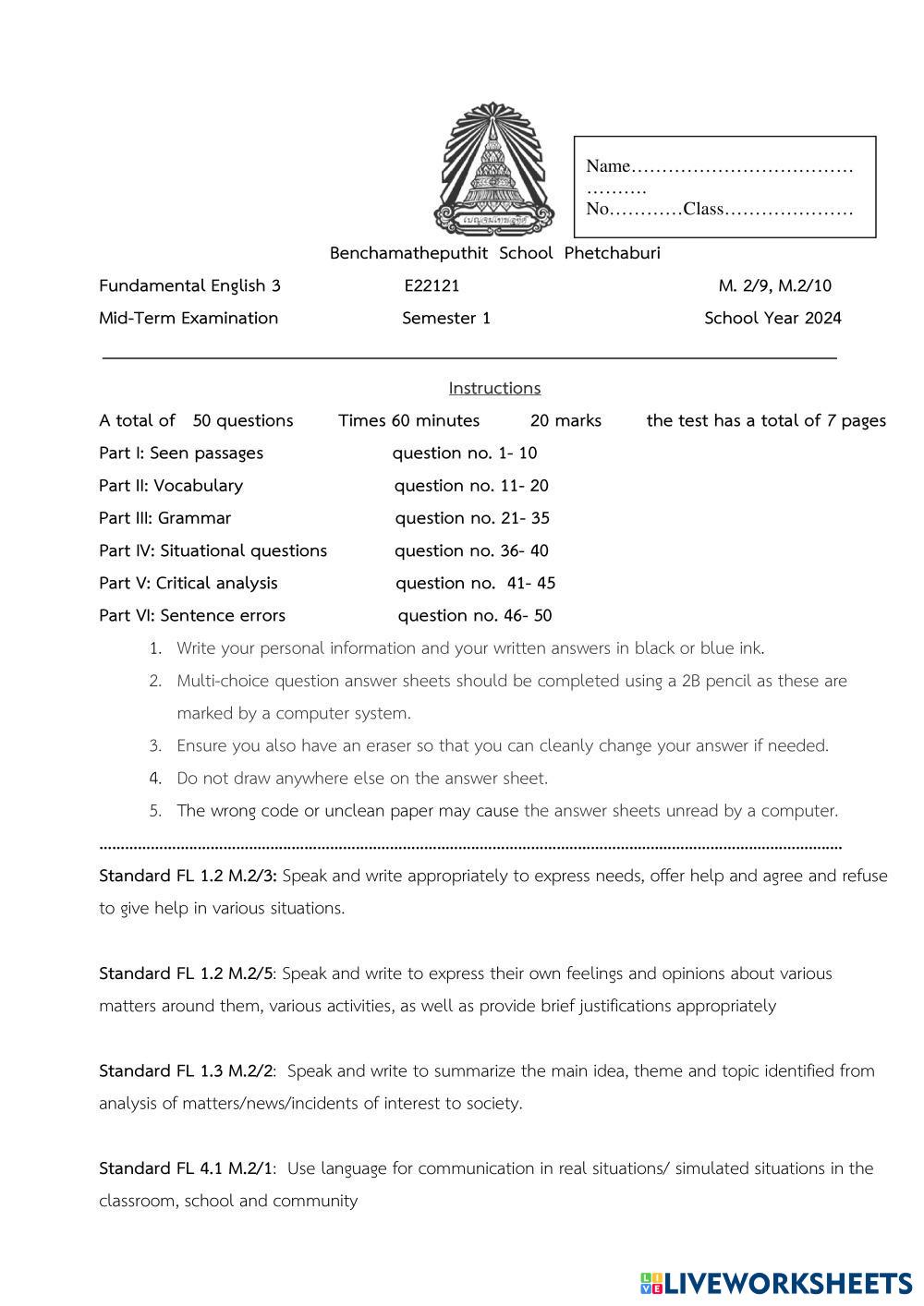 Created byMr. Christian Paul ENGLISH FUNDAMENTALS Midterm exams Age 14-18 level: grade 8 English Author's Instructions My Google Classroom Courses × 0 classes selected (0 students total) Quick Access Select all classes (0 classes) All Classes Loading courses... Cancel Share Share to selected Course __COURSE_NAME__ __STUDENT_NAME__ (__STUDENT_EMAIL__) M2 retest Download Worksheet Validation Check my answers Emails my answers to my teacher Full name Group/level School subject Teacher's email or key code Close Submit Validating worksheet... (12) Your answers have been sent to your teacher. Good luck! OK We encountered an error submitting your answers. Please try again. OK Advertisement | Go Ad Free Created byMr. Christian Paul ENGLISH FUNDAMENTALS Midterm exams Age 14-18 level: grade 8 English Author's Instructions
