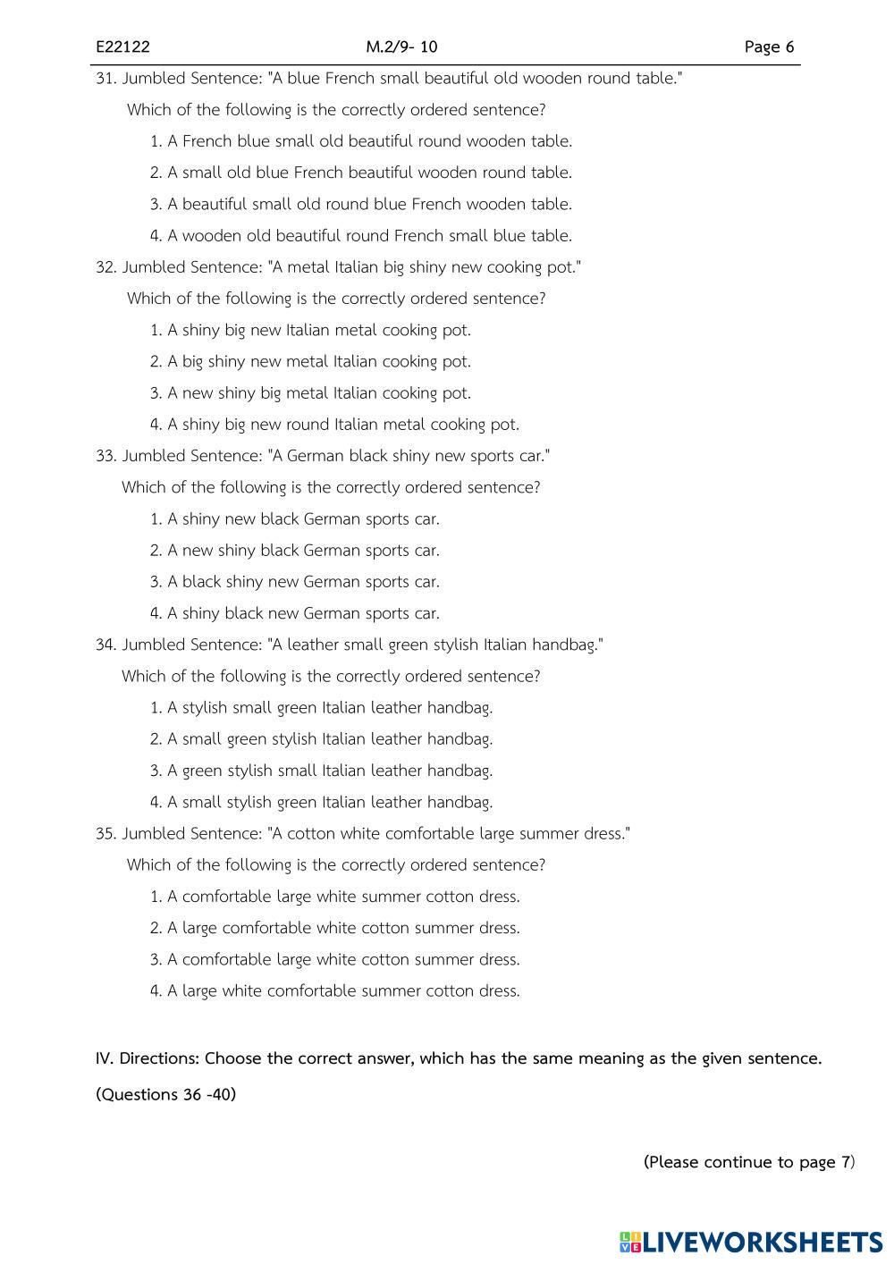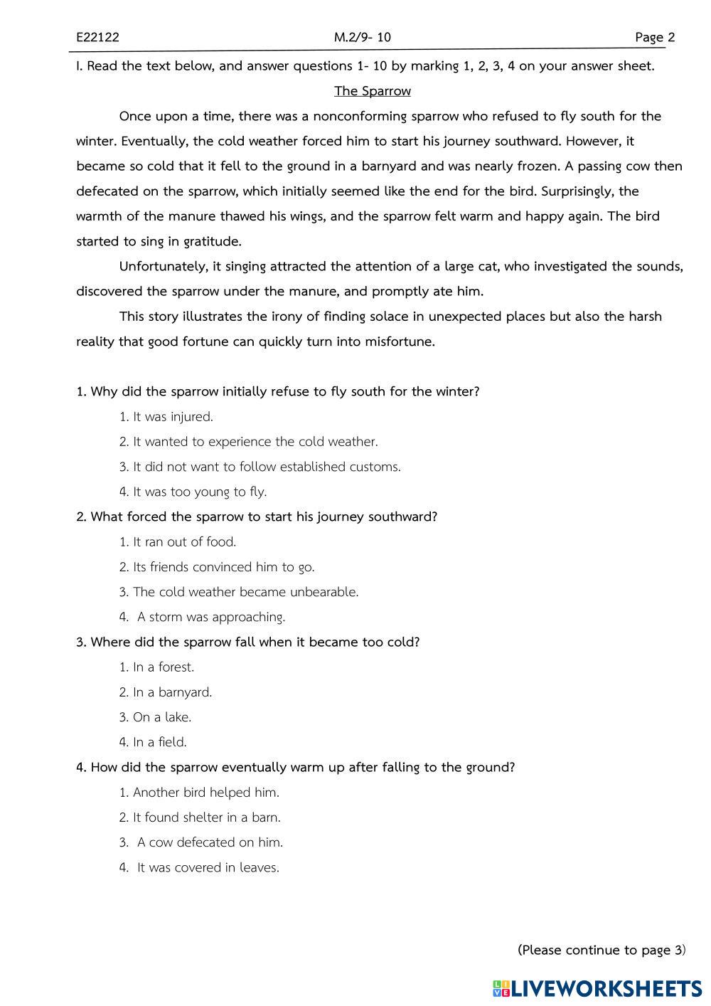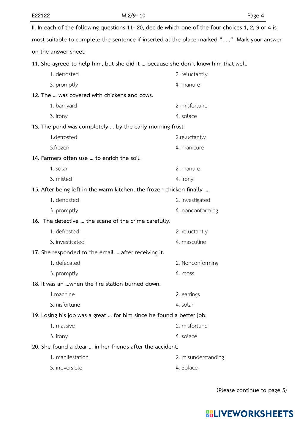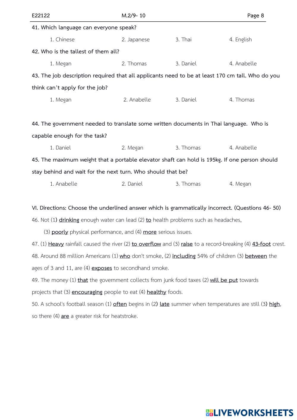 Created byMr. Christian Paul ENGLISH FUNDAMENTALS Midterm exams Age 14-18 level: grade 8 English Author's Instructions My Google Classroom Courses × 0 classes selected (0 students total) Quick Access Select all classes (0 classes) All Classes Loading courses... Cancel Share Share to selected Course __COURSE_NAME__ __STUDENT_NAME__ (__STUDENT_EMAIL__) M2 retest Download Worksheet Validation Check my answers Emails my answers to my teacher Full name Group/level School subject Teacher's email or key code Close Submit Validating worksheet... (12) Your answers have been sent to your teacher. Good luck! OK We encountered an error submitting your answers. Please try again. OK Advertisement | Go Ad Free Created byMr. Christian Paul ENGLISH FUNDAMENTALS Midterm exams Age 14-18 level: grade 8 English Author's Instructions