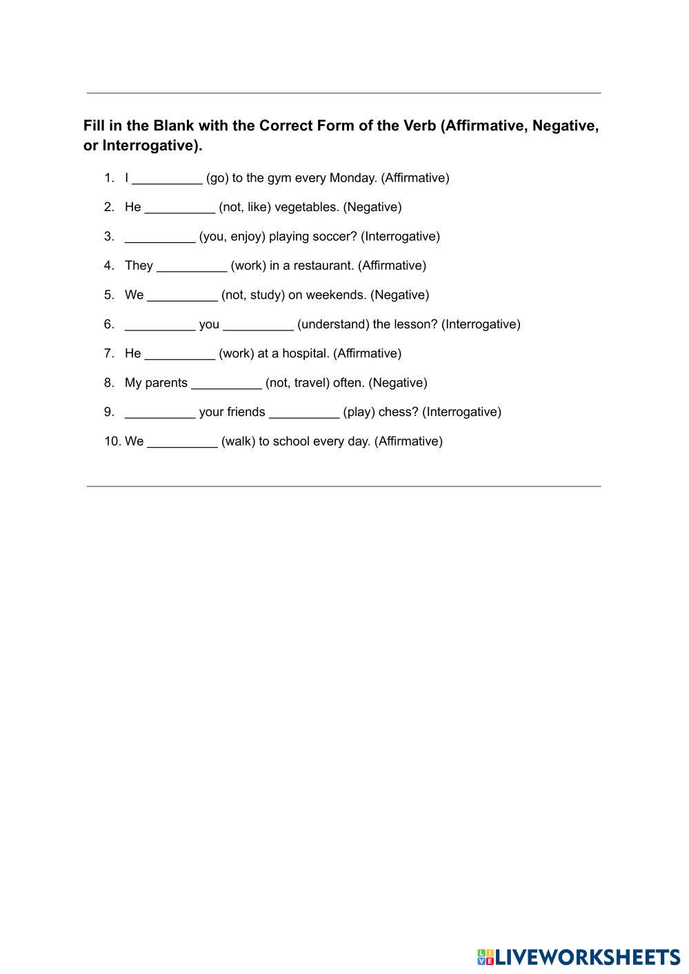 Created byKrista Maritere Espinosa Rojas English grammar Simple Present Age 7-18 level: Beginners English Author's Instructions My Google Classroom Courses × 0 classes selected (0 students total) Quick Access Select all classes (0 classes) All Classes Loading courses... Cancel Share Share to selected Course __COURSE_NAME__ __STUDENT_NAME__ (__STUDENT_EMAIL__) Simple present evaluation Download Worksheet Validation Check my answers Emails my answers to my teacher Full name Group/level School subject Teacher's email or key code Close Submit Validating worksheet... (12) Your answers have been sent to your teacher. Good luck! OK We encountered an error submitting your answers. Please try again. OK Advertisement | Go Ad Free Created byKrista Maritere Espinosa Rojas English grammar Simple Present Age 7-18 level: Beginners English Author's Instructions