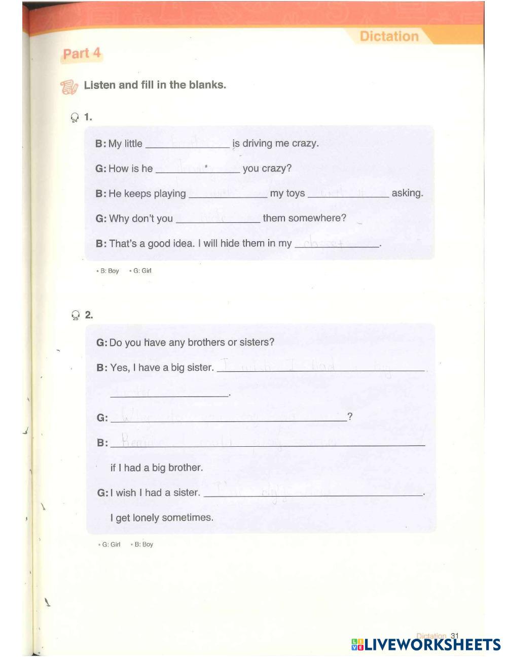 Created byPhan Anh English Language Elementary 4th grade Grammar English Author's Instructions test My Google Classroom Courses × 0 classes selected (0 students total) Quick Access Select all classes (0 classes) All Classes Loading courses... Cancel Share Share to selected Course __COURSE_NAME__ __STUDENT_NAME__ (__STUDENT_EMAIL__) 2` Download Worksheet Validation Check my answers Emails my answers to my teacher Full name Group/level School subject Teacher's email or key code Close Submit Validating worksheet... (12) Your answers have been sent to your teacher. Good luck! OK We encountered an error submitting your answers. Please try again. OK Advertisement | Go Ad Free Created byPhan Anh English Language Elementary 4th grade Grammar English Author's Instructions test Explore Worksheets 11D-2 English Language 4th grade 11D-2 Grammar - English Language Wohin I love my town English Language 4th grade I love my town Grammar - English Language Read and Complete FF4 English Language 4th grade FF4 Grammar - English Language do the exercises Present Simple vs Present Continuous English Language 4th grade Present Simple vs Present Continuous Grammar - English Language Use the elements provided to make sentences using the Present Simple or the Present Continuous.