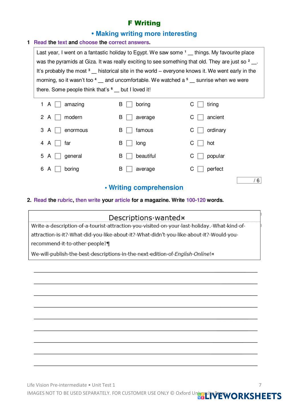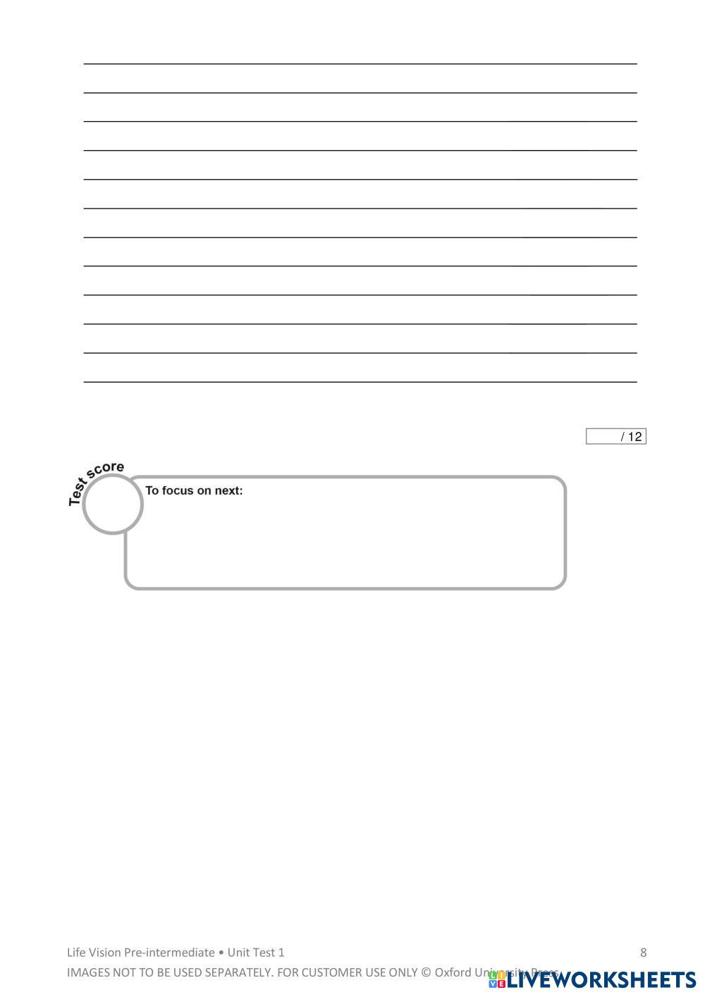 Created by Nikora English Language Middle School 8th grade Grammar English Author's Instructions test My Google Classroom Courses × 0 classes selected (0 students total) Quick Access Select all classes (0 classes) All Classes Loading courses... Cancel Share Share to selected Course __COURSE_NAME__ __STUDENT_NAME__ (__STUDENT_EMAIL__) LV A2/B1 Download Worksheet Validation Check my answers Emails my answers to my teacher Full name Group/level School subject Teacher's email or key code Close Submit Validating worksheet... (12) Your answers have been sent to your teacher. Good luck! OK We encountered an error submitting your answers. Please try again. OK Advertisement | Go Ad Free Created by Nikora English Language Middle School 8th grade Grammar English Author's Instructions test Explore Worksheets L1 VC1 English Language 8th grade L1 VC1 Grammar - English Language Complete the following chart. Gerund or infinitive English Language 8th grade Gerund or infinitive Grammar - English Language Choose the correct answer Online_Viet Teacher_S8_W13_U1&2_Grammar Revision English Language 8th grade Online_Viet Teacher_S8_W13_U1&2_Grammar Revision Grammar - English Language Online_Viet Teacher_S8_W13_U1&2_Grammar Revision unit5 English Language 8th grade unit5 Grammar - English Language Countable and uncountable nouns