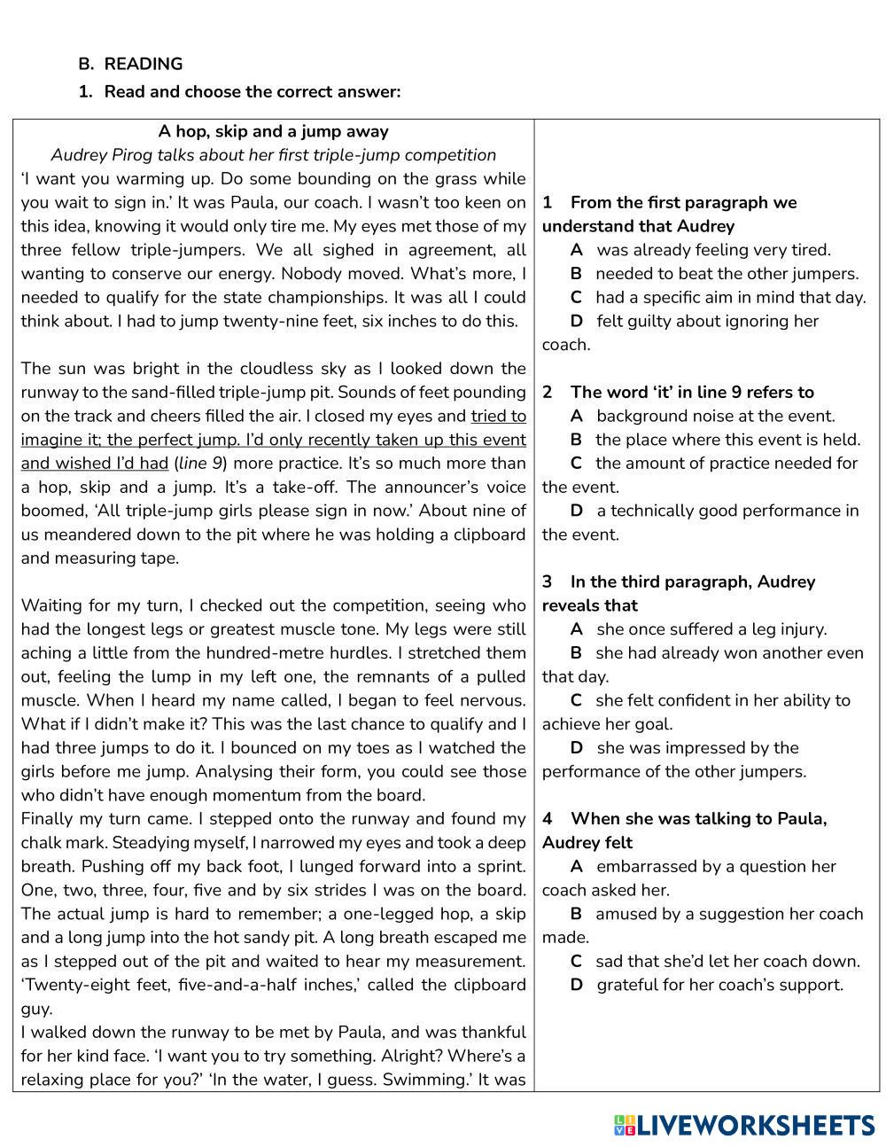Created by Brie12 English Language Middle School 8th grade Grammar English Author's Instructions UOE REVISION My Google Classroom Courses × 0 classes selected (0 students total) Quick Access Select all classes (0 classes) All Classes Loading courses... Cancel Share Share to selected Course __COURSE_NAME__ __STUDENT_NAME__ (__STUDENT_EMAIL__) GE9 UNIT 7 SPORTS 3 Download Worksheet Validation Check my answers Emails my answers to my teacher Full name Group/level School subject Teacher's email or key code Close Submit Validating worksheet... (12) Your answers have been sent to your teacher. Good luck! OK We encountered an error submitting your answers. Please try again. OK Advertisement | Go Ad Free Created by Brie12 English Language Middle School 8th grade Grammar English Author's Instructions UOE REVISION Explore Worksheets Past continuous English Language 8th grade Past continuous Grammar - English Language Chia động từ thì quá khứ tiếp diễn VERB TO BE IN PAST English Language 8th grade VERB TO BE IN PAST Grammar - English Language READ THE SENTENCES AND COMPLE THEM WITH THE CORRECT VERB IN PAST G9 GK II Phu Thuong P2 Practice English Language 8th grade G9 GK II Phu Thuong P2 Practice Grammar - English Language G9 GK II Phu Thuong P2 Practice GRADE 8.7 - GHK II English Language 8th grade GRADE 8.7 - GHK II Grammar - English Language Do exercise