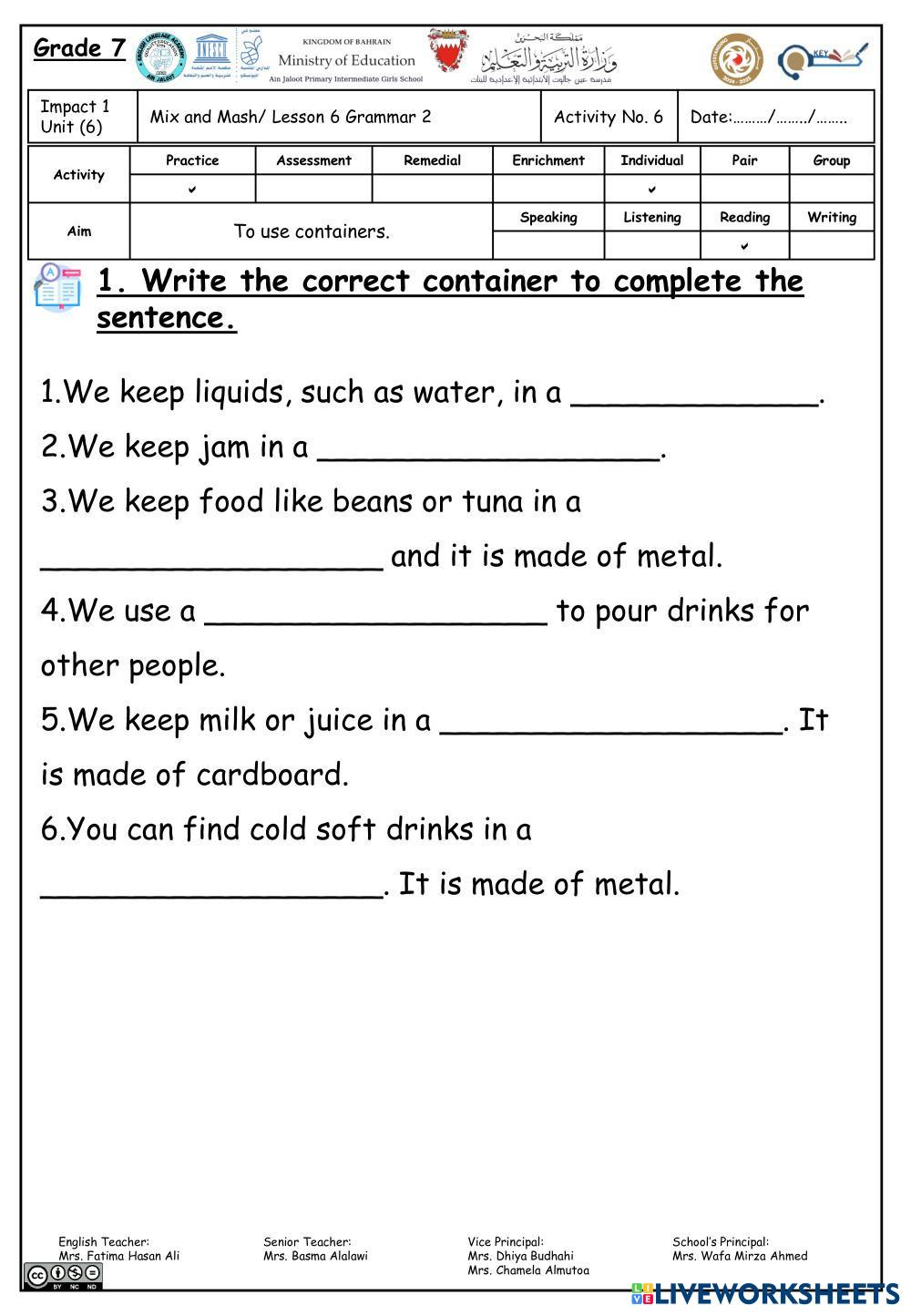 Created by fofo3 English Language Middle School 7th grade Grammar English Author's Instructions Fill in the blanks with the correct container. My Google Classroom Courses × 0 classes selected (0 students total) Quick Access Select all classes (0 classes) All Classes Loading courses... Cancel Share Share to selected Course __COURSE_NAME__ __STUDENT_NAME__ (__STUDENT_EMAIL__) G7U6L6 Download Worksheet Validation Check my answers Emails my answers to my teacher Full name Group/level School subject Teacher's email or key code Close Submit Validating worksheet... (12) Your answers have been sent to your teacher. Good luck! OK We encountered an error submitting your answers. Please try again. OK Advertisement | Go Ad Free Created by fofo3 English Language Middle School 7th grade Grammar English Author's Instructions Fill in the blanks with the correct container. Explore Worksheets should - shouldn't English Language 7th grade should - shouldn't Grammar - English Language Read and choose the correct answer: Grammar Worksheet English Language 7th grade Grammar Worksheet Grammar - English Language Choose the correct answer Grammar Revision English Language 7th grade Grammar Revision Grammar - English Language Read and choose the correct answer: TA7 - Đề cương GK2 THCS Nguyễn Huy Tưởng 25-26 (No.2) English Language 7th grade TA7 - Đề cương GK2 THCS Nguyễn Huy Tưởng 25-26 (No.2) Grammar - English Language Mid second semester test
