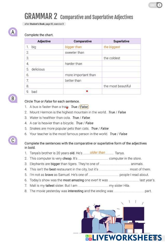 Created by 13627 English Language Middle School 8th grade Grammar English Author's Instructions Answer the questions. My Google Classroom Courses × 0 classes selected (0 students total) Quick Access Select all classes (0 classes) All Classes Loading courses... Cancel Share Share to selected Course __COURSE_NAME__ __STUDENT_NAME__ (__STUDENT_EMAIL__) Adjectives- comparatives and superlatives. Download Worksheet Validation Check my answers Emails my answers to my teacher Full name Group/level School subject Teacher's email or key code Close Submit Validating worksheet... (12) Your answers have been sent to your teacher. Good luck! OK We encountered an error submitting your answers. Please try again. OK Advertisement | Go Ad Free Created by 13627 English Language Middle School 8th grade Grammar English Author's Instructions Answer the questions. Explore Worksheets Online_Viet Teacher_S8_W28_U8_Grammar 2 & Grammar 1 Revision English Language 8th grade Online_Viet Teacher_S8_W28_U8_Grammar 2 & Grammar 1 Revision Grammar - English Language Online_Viet Teacher_S8_W28_U8_Grammar 2 & Grammar 1 Revision VERSION STANDARD TEST UNIT 6 English Language 8th grade VERSION STANDARD TEST UNIT 6 Grammar - English Language ANSWER THE QUESTIONS M5-HW03-Revision-Must-Need to-Have to English Language 8th grade M5-HW03-Revision-Must-Need to-Have to Grammar - English Language Read carefully to answer well. M5-HW08-Revision-So-too-Neither-either English Language 8th grade M5-HW08-Revision-So-too-Neither-either Grammar - English Language Read carefully to answer well.
