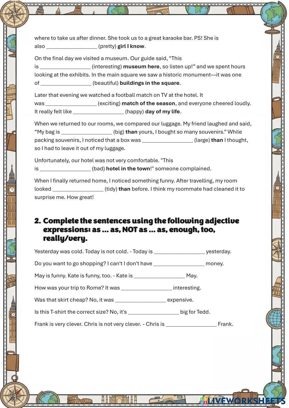 Created byLiis L English Language Middle School 6th grade Grammar English Author's Instructions Choose the correct answers. My Google Classroom Courses × 0 classes selected (0 students total) Quick Access Select all classes (0 classes) All Classes Loading courses... Cancel Share Share to selected Course __COURSE_NAME__ __STUDENT_NAME__ (__STUDENT_EMAIL__) Comparatives and Superlatives Download Worksheet Validation Check my answers Emails my answers to my teacher Full name Group/level School subject Teacher's email or key code Close Submit Validating worksheet... (12) Your answers have been sent to your teacher. Good luck! OK We encountered an error submitting your answers. Please try again. OK Advertisement | Go Ad Free Created byLiis L English Language Middle School 6th grade Grammar English Author's Instructions Choose the correct answers. Explore Worksheets Unit 8 - Test 1 - Grade 6 kỳ 2 English Language 6th grade Unit 8 - Test 1 - Grade 6 kỳ 2 Grammar - English Language PRACTICE PET PRACTICE 1 English Language 6th grade PET PRACTICE 1 Grammar - English Language ... Unit 7 - Test 2 - Grade 6 kỳ 2 English Language 6th grade Unit 7 - Test 2 - Grade 6 kỳ 2 Grammar - English Language practice Unit 7 - Test 1 - Grade 6 kỳ 2 English Language 6th grade Unit 7 - Test 1 - Grade 6 kỳ 2 Grammar - English Language practice