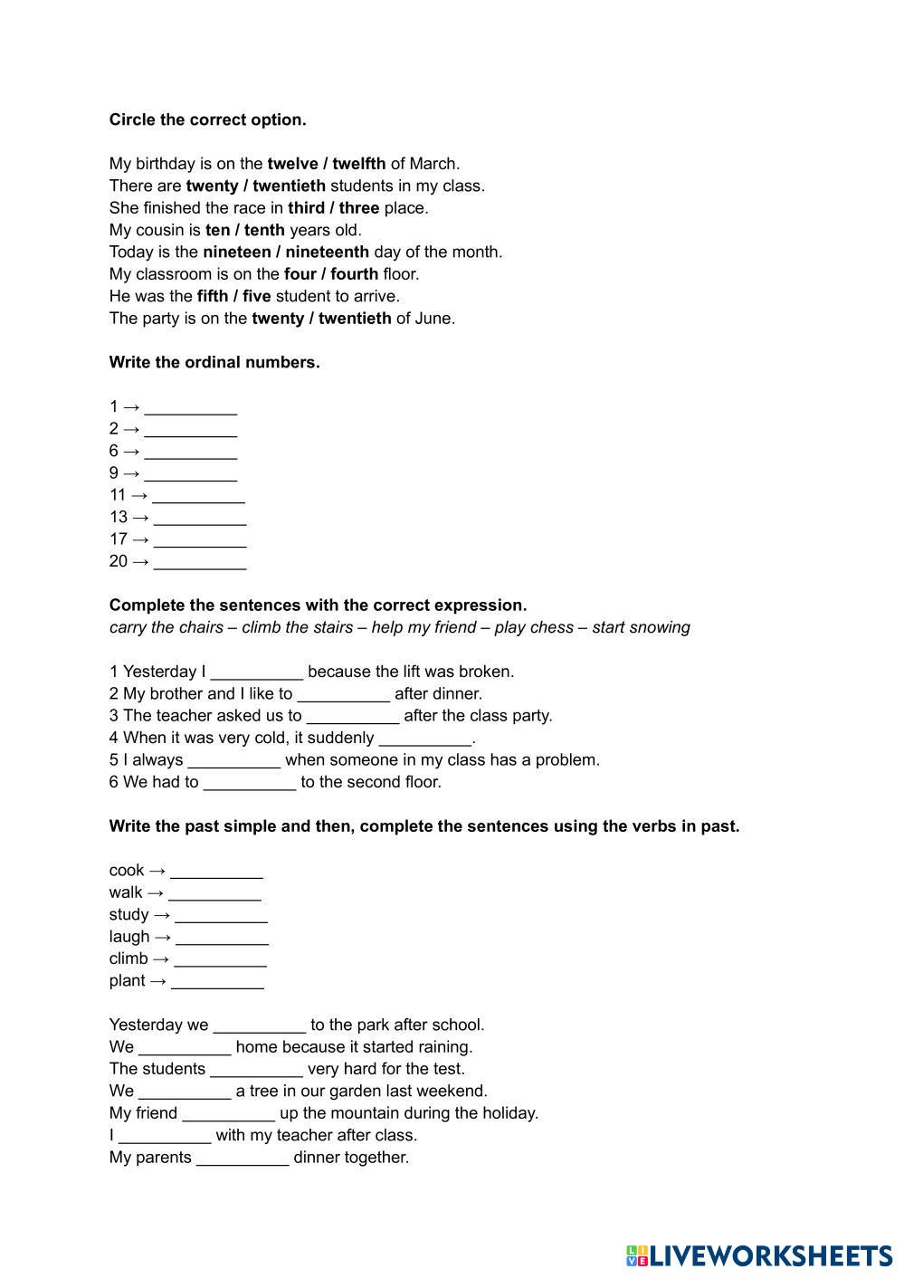 Created byvaleria English Language Elementary 4th grade Grammar English Author's Instructions Review for the unit My Google Classroom Courses × 0 classes selected (0 students total) Quick Access Select all classes (0 classes) All Classes Loading courses... Cancel Share Share to selected Course __COURSE_NAME__ __STUDENT_NAME__ (__STUDENT_EMAIL__) Unit 4 Kid's Box Download Worksheet Validation Check my answers Emails my answers to my teacher Full name Group/level School subject Teacher's email or key code Close Submit Validating worksheet... (12) Your answers have been sent to your teacher. Good luck! OK We encountered an error submitting your answers. Please try again. OK Advertisement | Go Ad Free Created byvaleria English Language Elementary 4th grade Grammar English Author's Instructions Review for the unit Explore Worksheets Grammar Friends 4 - Unit 14 English Language 4th grade Grammar Friends 4 - Unit 14 Grammar - English Language Grammar Friends 4 - Unit 14 P.4 Unit 7 Test English Language 4th grade P.4 Unit 7 Test Grammar - English Language Unit 7 Test lớp 4 English Language 4th grade lớp 4 Grammar - English Language Điền từ vào chỗ trống Past Simple Negative and Interrogative English Language 4th grade Past Simple Negative and Interrogative Grammar - English Language Complete the gaps with the correct missing words.