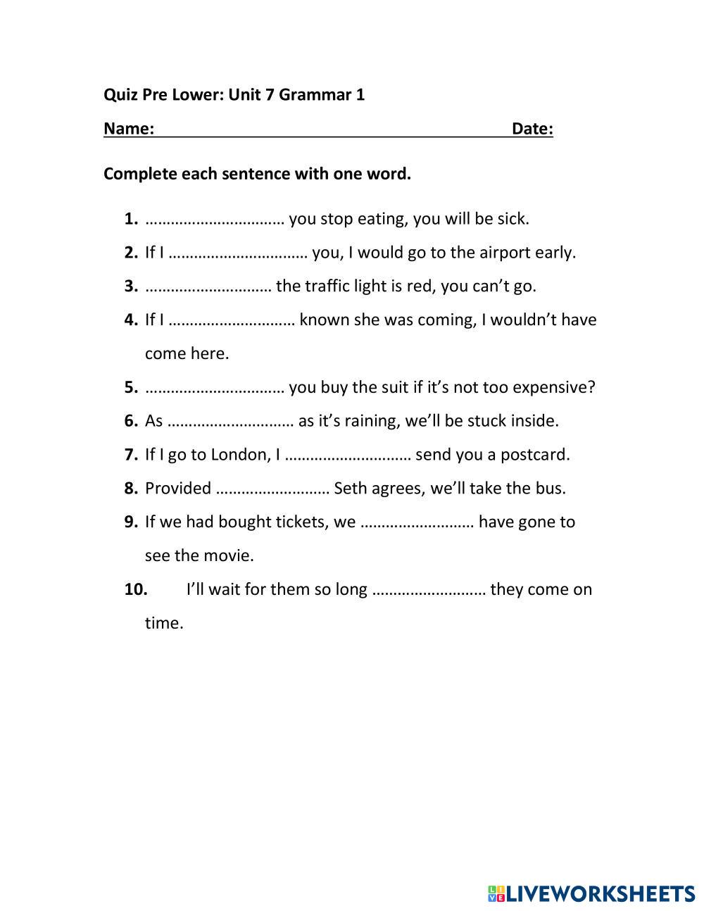 Created by Nadpad English Language Middle School 7th grade Grammar English Author's Instructions Grammar My Google Classroom Courses × 0 classes selected (0 students total) Quick Access Select all classes (0 classes) All Classes Loading courses... Cancel Share Share to selected Course __COURSE_NAME__ __STUDENT_NAME__ (__STUDENT_EMAIL__) Quiz Pre Lower Unit 7 Grammar 1 Download Worksheet Validation Check my answers Emails my answers to my teacher Full name Group/level School subject Teacher's email or key code Close Submit Validating worksheet... (12) Your answers have been sent to your teacher. Good luck! OK We encountered an error submitting your answers. Please try again. OK Advertisement | Go Ad Free Created by Nadpad English Language Middle School 7th grade Grammar English Author's Instructions Grammar Explore Worksheets Grammar 5-Review 3 English Language 7th grade Grammar 5-Review 3 Grammar - English Language Grammar 5-Review 3 Grammar 5-Review 1 English Language 7th grade Grammar 5-Review 1 Grammar - English Language Grammar 5-Review 1 Grammar 5-Unit 11 English Language 7th grade Grammar 5-Unit 11 Grammar - English Language Grammar 5-Unit 11 VERB TO BE English Language 7th grade VERB TO BE Grammar - English Language Complete the following sentences.
