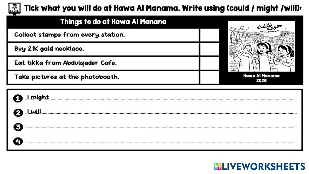 Tick what you will do at Hawa Al Manama. Write using (could / might /will):