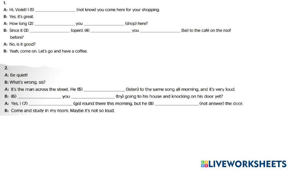 Created by alexiaflp English Language Middle School 6th grade Grammar English Author's Instructions Commplete the dialogues using Past Simple, Present Perfect Simple, or Present Prefect Continuous. My Google Classroom Courses × 0 classes selected (0 students total) Quick Access Select all classes (0 classes) All Classes Loading courses... Cancel Share Share to selected Course __COURSE_NAME__ __STUDENT_NAME__ (__STUDENT_EMAIL__) Past Simple, Present Perfect Simple, Present Prefect Continuous Download Worksheet Validation Check my answers Emails my answers to my teacher Full name Group/level School subject Teacher's email or key code Close Submit Validating worksheet... (12) Your answers have been sent to your teacher. Good luck! OK We encountered an error submitting your answers. Please try again. OK Advertisement | Go Ad Free Created by alexiaflp English Language Middle School 6th grade Grammar English Author's Instructions Commplete the dialogues using Past Simple, Present Perfect Simple, or Present Prefect Continuous. Explore Worksheets ĐỀ ÔN GK 2-TA6 English Language 6th grade ĐỀ ÔN GK 2-TA6 Grammar - English Language ĐỀ ÔN GK 2-TA6 Simple Past exercises English Language 6th grade Simple Past exercises Grammar - English Language Read and complete: Simple past tense WAS-WERE English Language 6th grade Simple past tense WAS-WERE Grammar - English Language CHOOSE CORRECT ONE Simple past tense ( was or did) English Language 6th grade Simple past tense ( was or did) Grammar - English Language Choose the best option
