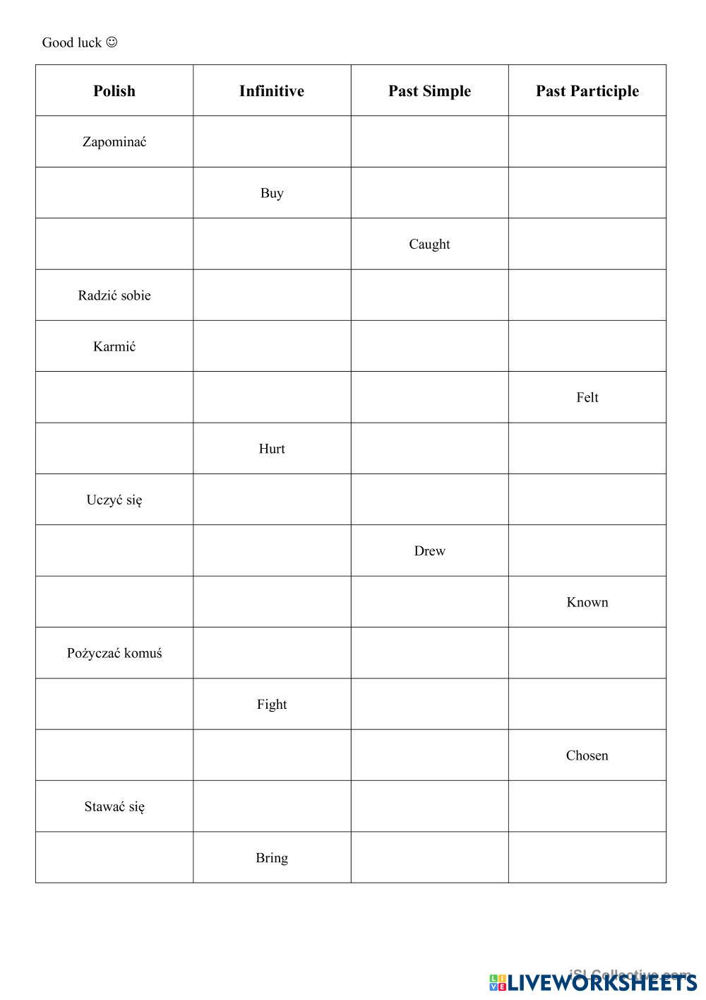 Created by MagdaWudzka English Language Middle School 8th grade Grammar English Author's Instructions Complete the table. My Google Classroom Courses × 0 classes selected (0 students total) Quick Access Select all classes (0 classes) All Classes Loading courses... Cancel Share Share to selected Course __COURSE_NAME__ __STUDENT_NAME__ (__STUDENT_EMAIL__) Irregular verbs Download Worksheet Validation Check my answers Emails my answers to my teacher Full name Group/level School subject Teacher's email or key code Close Submit Validating worksheet... (12) Your answers have been sent to your teacher. Good luck! OK We encountered an error submitting your answers. Please try again. OK Advertisement | Go Ad Free Created by MagdaWudzka English Language Middle School 8th grade Grammar English Author's Instructions Complete the table. Explore Worksheets Preposition of place English Language 8th grade Preposition of place Grammar - English Language - Skyryba English Language 8th grade Skyryba Grammar - English Language Tinkamai išskirkite priedėlius ir pažyminius. Reported Speech - Listening English Language 8th grade Reported Speech - Listening Grammar - English Language Listen then answer the question. Reported Speech English Language 8th grade Reported Speech Grammar - English Language Read the message then finish the sentences.