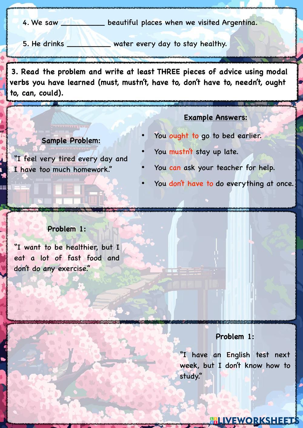 Created by upenglishcenterct English Language Middle School 6th grade Grammar English Author's Instructions Homework My Google Classroom Courses × 0 classes selected (0 students total) Quick Access Select all classes (0 classes) All Classes Loading courses... Cancel Share Share to selected Course __COURSE_NAME__ __STUDENT_NAME__ (__STUDENT_EMAIL__) PU5_quantifiers, modal verbs Download Worksheet Validation Check my answers Emails my answers to my teacher Full name Group/level School subject Teacher's email or key code Close Submit Validating worksheet... (12) Your answers have been sent to your teacher. Good luck! OK We encountered an error submitting your answers. Please try again. OK Advertisement | Go Ad Free Created by upenglishcenterct English Language Middle School 6th grade Grammar English Author's Instructions Homework Explore Worksheets EU6- UNIT REVISION English Language 6th grade EU6- UNIT REVISION Grammar - English Language NP2 EU6- UNIT REVISION GoGetter 2 English Language 6th grade GoGetter 2 Grammar - English Language jobs, Past Simple 2025/2026 P6 3rd term_ehw(1)_GPU U16 U17 English Language 6th grade 2025/2026 P6 3rd term_ehw(1)_GPU U16 U17 Grammar - English Language Finish ALL the exercise. Conditionals English Language 6th grade Conditionals Grammar - English Language Complete the exercises
