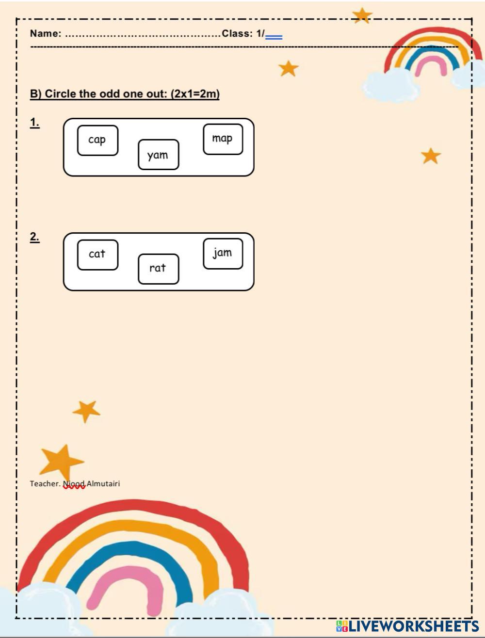 Created by Njooddd English Language Elementary 1st grade Phonics English Author's Instructions Multiple choice My Google Classroom Courses × 0 classes selected (0 students total) Quick Access Select all classes (0 classes) All Classes Loading courses... Cancel Share Share to selected Course __COURSE_NAME__ __STUDENT_NAME__ (__STUDENT_EMAIL__) Odd one out Download Worksheet Validation Check my answers Emails my answers to my teacher Full name Group/level School subject Teacher's email or key code Close Submit Validating worksheet... (12) Your answers have been sent to your teacher. Good luck! OK We encountered an error submitting your answers. Please try again. OK Advertisement | Go Ad Free Created by Njooddd English Language Elementary 1st grade Phonics English Author's Instructions Multiple choice Explore Worksheets Letter G English Language 1st grade Letter G Phonics - English Language Recognize words start with letter G Odd one out English Language 1st grade Odd one out Phonics - English Language Multiple choice Las figuras English Language 1st grade Las figuras Phonics - English Language Relaciona cada figura con su forma Odd one out English Language 1st grade Odd one out Phonics - English Language Multiple choice