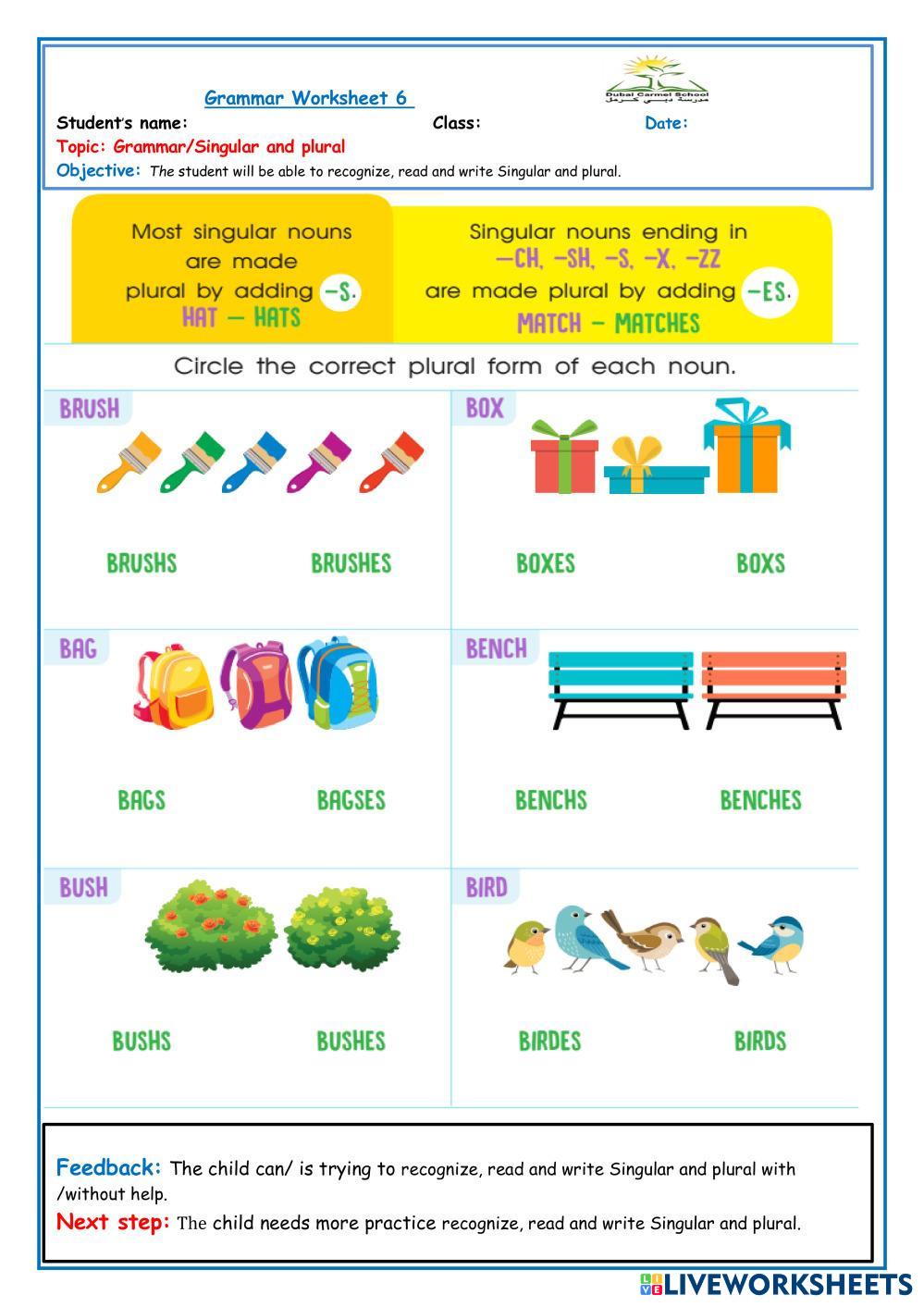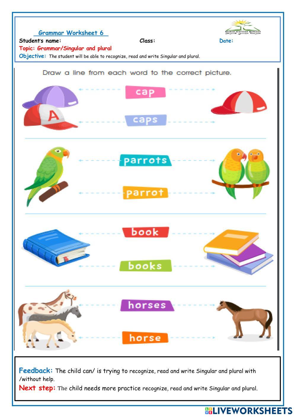 Created byesraabdulaziz English Language Early Learning Kindergarten Phonics English Author's Instructions read My Google Classroom Courses × 0 classes selected (0 students total) Quick Access Select all classes (0 classes) All Classes Loading courses... Cancel Share Share to selected Course __COURSE_NAME__ __STUDENT_NAME__ (__STUDENT_EMAIL__) singular and plural Download Worksheet Validation Check my answers Emails my answers to my teacher Full name Group/level School subject Teacher's email or key code Close Submit Validating worksheet... (12) Your answers have been sent to your teacher. Good luck! OK We encountered an error submitting your answers. Please try again. OK Advertisement | Go Ad Free Created byesraabdulaziz English Language Early Learning Kindergarten Phonics English Author's Instructions read Explore Worksheets 英文字母 P - S 自然發音 English Language Kindergarten 英文字母 P - S 自然發音 Phonics - English Language 英文字母 P - S 自然發音單字 letter y level1 English Language Kindergarten letter y level1 Phonics - English Language solve the liveworksheet Palabras con b English Language Kindergarten Palabras con b Phonics - English Language Actividad para leer palabras con la letra B y unir a las imágenes. colors English Language Kindergarten colors Phonics - English Language mm
