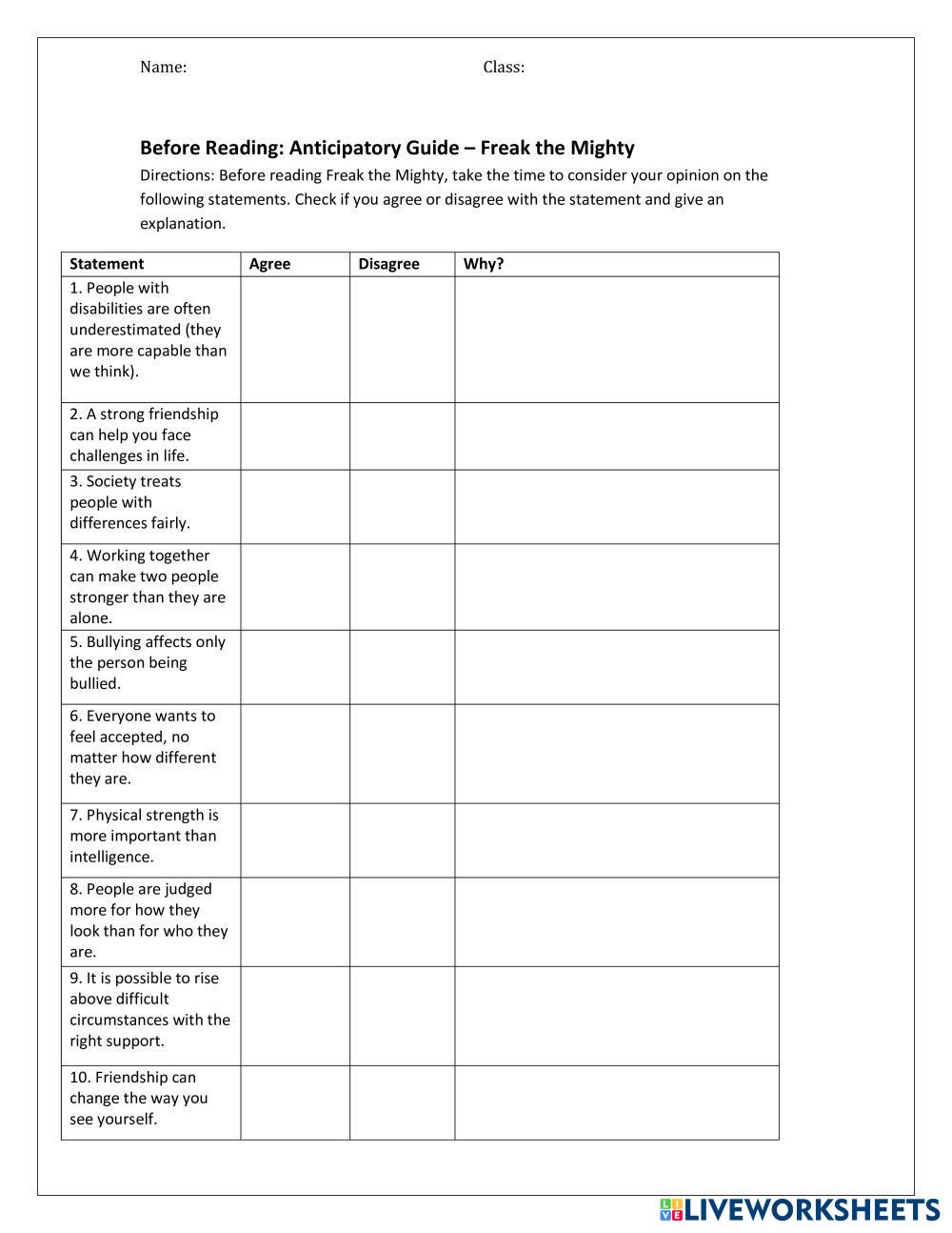 Directions: Before reading Freak the Mighty, take the time to consider your opinion on the following statements. Check if you agree or disagree with the statement and give an explanation.